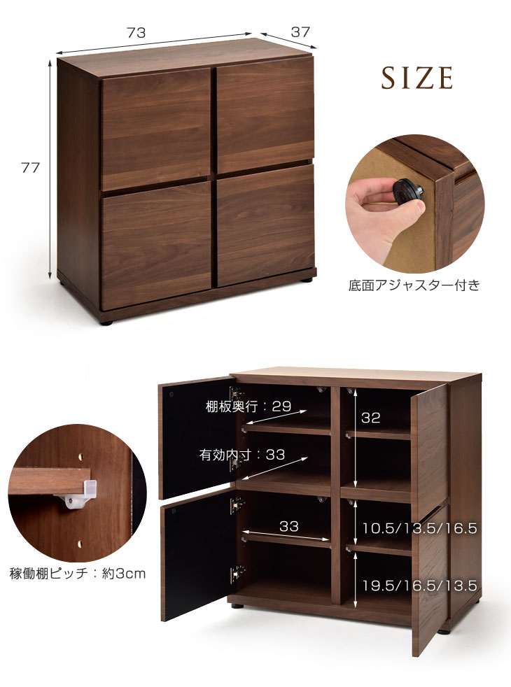 ▼シリーズ一覧 ▼ 幅73cm 2列4段 幅73cm 2列3段 幅110cm 3列2段 幅110cm 3列3段 仕様サイズ 外寸:幅73x奥行37x高さ77cm 内寸:幅33x奥行33x高さ32cm 奥行き有効内寸:35cm 可動棚ピッチ:3cm間隔×3段階 重量:30kg 【スタッフひーちゃんのおすすめポイント!】 ・家具の街、大川の職人による日本製 ・完成品でお届け ・扉の中に収納して、お部屋をスッキリ ・用途に合わせて3段階調節できる可動棚 ・可動棚には耐震ダボを設置 ・水平性を調節するアジャスター付き 国産・完成品。家具の街、大川の職人と当店の担当者が試行錯誤を重ねて完成させたこだわりの逸品。美しい木目がインテリアに映える、シンプルなキャビネット。収納したものを扉で隠し、お部屋をすっきり見せたい方にオススメです。内部には用途に合わせて調節できる可動棚をセット。小物の収納にはもちろん、棚を取り外して本棚としても。底面には床面との水平性を調節できるアジャスター付きです。 耐荷重 約30kg 材質天板:強化シート・MDF(フェザーコア)扉:強化シート・MDF 側面・背面:プリント化粧合板・MDF背面化粧仕上げ梱包サイズ 幅78x奥行42x高さ83cm生産国 日本備考【完成品】※配送は全て宅配便(1人)での玄関渡しとなります。大型商品や重量商品、エレベーターの無い2階以上にお住まいのお客様は、玄関口までの搬入をお手伝いをお願いしており ます事をご了承ください。送料【送料無料(北海道・沖縄県・離島は送料別途)】※北海道・沖縄県・離島の場合はお問い合わせください。※別途送料が必要な場合には、送料をご了承いただいてからの発送となります。