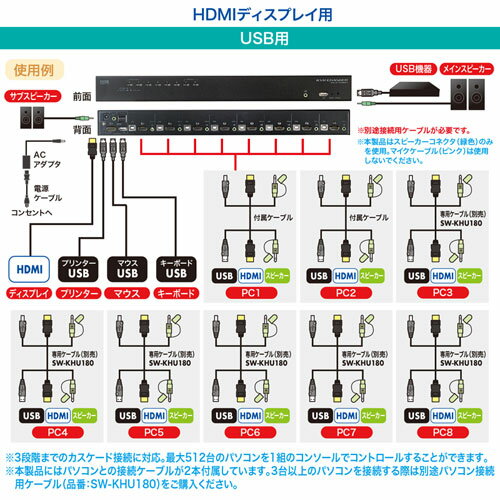 ↑↑↑正確な在庫状況は上記バナー「在庫状況を確認する」をクリックして頂き、必ずご確認ください。 ■1組のコンソール(キーボード・マウス・ディスプレイ)で8台までのパソコンを切り替えて操作できます。■HDMIディスプレイは最大解像度1920×1200(WUXGA)、1920×1080(フルHD)に対応し、ワイド画面出力にも対応します。■ディスプレイエミュレーション機能(EDID読み出し回路)を搭載しています。ディスプレイのEDIDを読み込みKVMに保存、DDC通信時に各ポートへ応答することで裏起動時に画面解像度が変わる、画面サイズが変わるという問題が発生しません。SWKVM8HUインターフェース: 【パソコン用】 ディスプレイ/HDMI(タイプA)メス×8 キーボード・マウス・USB2.0ハブ/USB Bコネクタメス×8 スピーカー/3.5mmステレオミニジャック×8 【周辺機器側】 ディスプレイ/HDMI(タイプA)メス×1 キーボード/USB Aコネクタメス×1 マウス/USB Aコネクタメス×1 スピーカー/3.5mmステレオミニジャック×2 USB2.0ハブ/USB Aコネクタメス×2切替方式:本体ボタン切替、ホットキー切替、オートスキャン切替、OSD切替切替音:ビープ音ON/OFF設定可能電源:ACアダプタ(DC5V 4A)消費電力:8.56W環境条件(結露なきこと): 動作時/温度0〜50℃、湿度80%以下 保存時/湿度-20℃〜60℃、湿度80%以下最大パソコン接続台数:8台ディスプレイエミュレーション機能:あり19インチマウントラック取り付け:ありサイズ:W433×D258×H44mm重量:約3.49kgHDCP:対応セット内容: 本体×1 ACアダプタ(DC5V 4A)×1 電源ケーブル×1 パソコン接続用ケーブル(1.8m)×2 ラックマウントキット(ブラケット×2、ネジ×6) グランド線(接地線) 取扱説明書(保証書付き) ゴム足×4 ラック固定用ネジ×4 ラック固定用ナット×4 ラック固定用ワッシャー×4対応機種: Windows搭載(DOS/V)パソコン、Apple Macシリーズ ※USB Aコネクタ メス、HDMI出力を持つ機種対応キーボード: USBキーボード ※キーボードに搭載されているUSBハブポートは本製品経由では使用することはできません。キーボードに搭載されている特殊ボタンなどドライバを要する機能についても本製品経由では使用することができません。 ※指紋認証機能付キーボード、トラックパッド付キーボードなどでは動作しないことがあります。 ※Bluetoothキーボード・Blutoothマウスには非対応です。 ※ゲーミングキーボードなどのNキーロールオーバー機能を搭載したキーボードは動作対応しません。対応マウス: USBマウス ※Bluetoothキーボード・Blutoothマウスには非対応です。対応ディスプレイ:HDMI入力端子を標準搭載しているテレビ・パソコン用ディスプレイ対応解像度:最大解像度1920×1200(WUXGA)、1920×1080(フルHD)まで表示可能対応スピーカー・マイク: 3.5mmステレオミニプラグ接続のスピーカー・マイク ※音声出力設定をHDMI Audioにしている場合はアナログ音声出力はできません。別途設定変更が必要です。対応OS: Windows 10・8.1・8・7・Vista・XP(32/64bit、各Edition対応) Windows Server 2019、2016、2012(R2)、Windows Server2008(R2)、Windows Server 2003(R2) macOS 10.12〜10.15、Mac OS X 10.6〜10.11 Linux(CentOS、uBuntu、OpenSUSE)19インチサーバーラック対応8ポートKVM