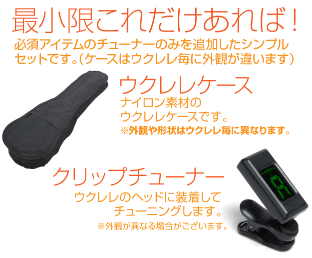 ※まとめて購入(¥820)の「ピンの取付け」をお選び頂くと、ボディエンドにピンを付けて発送いたします。ストラップ(肩掛け)の取付に便利です! ■シンプルセット内容 1. ウクレレ本体 2. ソフトケース 3. クリップチューナー ※各アイテムの外観や形状は写真と異なる場合もございます。 ■Maikai MKU-1 ウクレレについて フレンドリーでハッピーな楽器、ウクレレをはじめてみませんか? Maika'i MKU-1ウクレレは、ウクレレビギナーの方にピッタリの、ロープライスでカジュアルなウクレレです。女性やお子さんでも扱いやすいスタンダードなソプラノサイズで、可愛らしい音色が楽しめます。また、ビギナー向けのソプラノサイズにはめずらしく、フレット数が15フレットとなっているのも嬉しいですね。 カラー展開も豊富なので、お好みのカラーがきっと見つかりますよ!ウクレレを試してみたい方の最初の1本としてはもちろん、ちょっとしたギフトなどにもオススメです。家族やお友達と一緒にウクレレをスタートするのもとても楽しいです! ※マイカイウクレレは、気軽に、気楽にウクレレを手に取っていただけるように、低価格を目指しました。生産コストを抑えているため、塗装のムラやちいさなキズなど、仕上げにラフなところがありますので、あらかじめご了承くださいますようお願いいたします。 ※一回のご注文数が多い場合は、表示の出荷予定よりもお時間をいただく場合がございます。 ■ソプラノサイズについて スタンダードサイズとも呼ばれる、ウクレレの標準サイズです。全長は54センチ程度で大変コンパクトなソプラノは、まさに老若男女にオススメできるサイズです。 ウクレレらしい軽やかな音色と手軽さがソプラノの魅力。サラッと弾き語りするのにピッタリなサイズですが、伝説的なウクレレの名手ロイ・スメックやハーブ・オオタ氏のようにソプラノで華麗なソロを奏でるプレイヤーも数多く存在します。迷ったら、まずはソプラノからスタートしてみましょう! ■スペック サイズ ソプラノ 全長 約540mm 重さ 約420g ボディ厚 約67mm ボディ幅 最大部182mm トップ材 ファルカタ サイド/バック材 ファルカタ ネック材 ナトー スケール長 344mm 指板/ブリッジ材 ウォルナット ナット/サドル材 牛骨 ナット幅 38mm ペグ オープンギアペグ フレット数 15 ※予告なく変更になる場合がございます。 ※プレゼント包装は行っておりません。ご了承ください。
