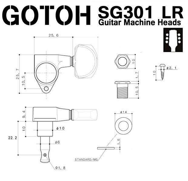 【信頼のゴトーペグ】安定したチューニングと耐久性で、日本はもとより世界のギターブランドで採用される信頼のブランドです。 SG301はレスポールやアコギに使用されるグローバータイプのギターペグです。右側3個、左側3個の6個セット。 ギア比 1:18 カラー ゴールド 付属品 ワッシャー、ナット、木ネジ お取付けのギターメーカーや機種により、取付け加工を必要とする場合がございます。上記サイズ表をご確認のいただき、ご購入頂きますよう宜しくお願いいたします。