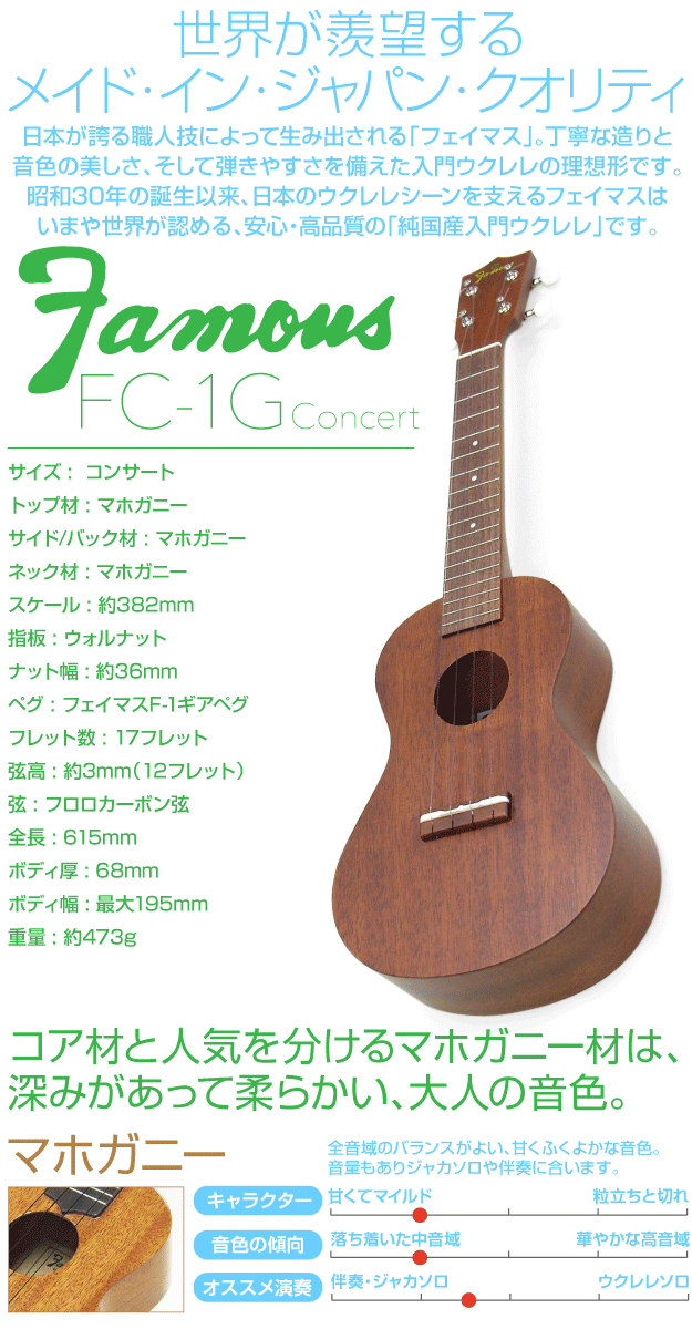 Famous フェイマス FC-1G スタンド付き 簡単6点セット 国産コンサートウクレレ マホガニー KIWAYA (甘い音色)(ソロ向き)(u)