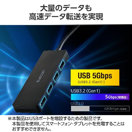 ↑↑↑正確な在庫状況は上記バナー「在庫状況を確認する」をクリックして頂き、必ずご確認ください。 ■USB-Aポート×4を搭載。マウスやキーボード、USBメモリなどをこの1台にまとめて接続できます。※本製品はUSBポートを増設するための製品です。本製品を使用してスマートフォン・タブレットを充電することはおすすめできません。■USB Type-Cコネクターは、表と裏がなく、向きを気にせず挿し込み可能です。■USB 5Gbps(USB3.2(Gen1))対応でUSB2.0の10倍以上の転送速度を実現します。※理論値U3HCH041BKコネクター仕様(アップストリーム):USB Type-C(TM)プラグ×1[USB 5Gbps(USB3.2(Gen1))/USB2.0/USB1.1]USBポート(ダウンストリーム):USB-Aポート×4[USB 5Gbps(USB3.2(Gen1))]対応OS(Windows):Windows 11/10 対応OS(macOS):macOS Sequoia 15 対応OS(iOS):iOS 18 対応OS(iPadOS):iPadOS 18 対応OS 備考:※各OSの最新バージョンへのアップデートや、サービスパックのインストールが必要になる場合があります。 ケーブル長:約30cm ※コネクター含まず 電源方式:バスパワー 動作環境:温度5℃〜40℃、湿度30%〜80%(結露なきこと)VCCI:Class B対応 カラー:ブラック 外形寸法:幅約94mm×奥行約31mm×高さ約10mm ※ケーブル含まず 重量:約36g 保証期間:1年間USB-Aポートを増やしてデスクまわりをすっきり。