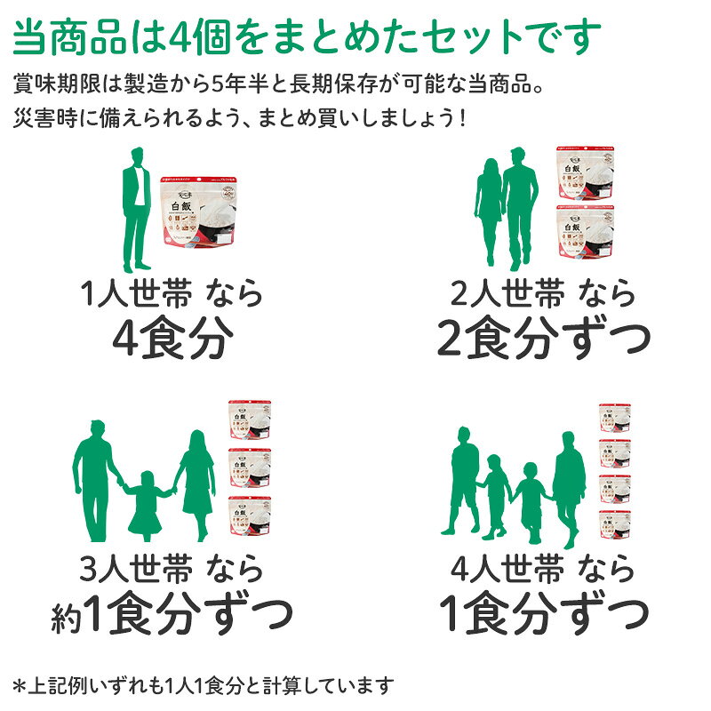 商品詳細 ◆品名 4食セット アルファー食品 安心米クイック 五目ご飯 70g×4食分 ◆個数 4食入 ◆サイズ 高さ15×横16×底マチ8.4cm ◆内容量 70g×4食分 ◆できあがり量 約220g(お茶碗大盛り1杯分) ◆1袋当たりのカロリー 261kcal ◆原材料 うるち米(国産)、味付乾燥具材(ごぼう、水煮たけのこ、こんにゃく、食塩、乾しいたけ、乾燥にんじん、砂糖、かつお節エキス)、調味料(アミノ酸等)、加工デンプン、カラメル色素、水酸化カルシウム ◆栄養成分 熱量261kcal、たんぱく質5.0g、脂質0.6g、炭水化物59.0g、食塩相当量1.7g ◆賞味期限 製造日より5年6ヶ月 ※【当店からの発送時点】において賞味期限まで残り5年以上の商品のお届けとなります。 ◆召し上がり方 1.開封後、脱酸素剤とスプーンを取り出し、袋の底をよく広げてください。 2.お湯か水を袋内側注水線(150ml)まで注ぎ、すぐによくまぜてください。 3.袋のチャックを閉じてお待ちください。(熱湯で約5分、約20℃の水で約30分) 出来あがったら底から混ぜてください。 4.袋のままでも、器に盛りつけても召しあがっていただけます。 ◆アレルギー対策 ・特定原材料等28品目を使用しておりません。 ・特定原材料等28品目を持ち込まないように厳密に管理された工場で製造しています。 ・表示義務7品目については、アレルギー物質の自主検査を実施しています。 ・より安全・安心をお届けするため、製造工場ラインのアレルギー物質(表示義務7品目)のふき取り検査を定期的に実施し、アレルギー物質の持ち込み、残存がないことを確認しています。 ・2019年9月に表示推奨品に追加された「アーモンド」にも対応しております。 ◆各種認証 ・日本災害食学会認証 ・FSSC22000認証 ・ISO22000認証(本社工場) ◆詳細 お湯を注いで5分で完成!(水の場合は30分) 安心米(戻り時間:熱湯の場合15分)と比較すると熱湯の場合10分も短い待ち時間で召しあがることができるので、非常時に避難所やご自宅でさらに温かい状態での喫食が可能になります。 日常では「時短ごはん」として便利にご使用いただけます。 また、少ない水でメスティンなどを使用したアレンジレシピも時短調理が可能なため、水やガスバーナーなどの燃料を節約したいアウトドアユーザーにもおすすめです。 安心米に比べ、安心米クイックは“軽くてやさしい食感”が特長です。 特定原材料等(アレルギー物質)28品目不使用の食物アレルギーに配慮した長期保存食です。 国産米を100%使用、特定原材料等(アレルギー物質)28品目不使用。 中にスプーンが入っていて、袋が容器になるので袋のまま食べられます。 ■こんな時にも便利です 登山・アウトドア/海外旅行・長期渡航/食物アレルギーをお持ちの方の外出時/小腹がすいたとき/体調不良で寝込んだ時/買い物ができない悪天候時/オフィスでの災害用備蓄 ■5年保存が可能 ■特定原材料等28品目不使用で安心 ■コンパクトで持ち運びに便利 ■お湯を入れても倒れにくいスタンドタイプ ■食器不要(スプーン付き) ◆ご注意ください * 仕入れカートンや製造ロットをまたいでの同梱の可能性があり、お届け商品すべての賞味期限が一致しない場合がございます。あらかじめご了承ください。 * お客様のモニターの設定により実物の色味と異なって見える可能性がございます。 * メーカー提供サイズ、または実寸サイズを計測しておりますが素材等により個体差がございます。 * メーカー側で予告なく細部のデザイン変更を行う場合がございます。 * 入荷時期の違いにより、写真と仕様が異なる製品をお届けする場合がございますが、仕様のご指定や仕様の違いによる返品や交換には対応いたしかねます。ご了承ください。