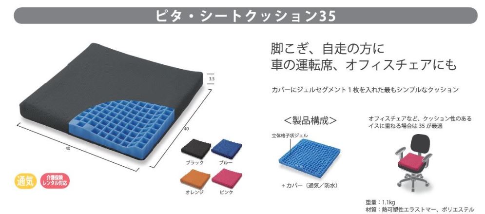 商品の仕様 ●サイズ/幅40×奥行40×厚さ3.5cm ●重さ/1.1kg ●材質/本体:立体格子状ジェル(熱可塑性エラストマー)、カバー:ポリエステル(スベリ止め加工付) ●生産国/日本(カバー:中国) 商品の説明 ・立体格子状ジェルの効果により、体圧を吸収し、身体をしっかり支えます。通気性に優れ、カバー、中材すべて水洗いができます。 ・体圧分散性、高通気性、家庭洗濯OK。 ・長時間使用でも疲れない、最高レベルの座り心地。 ・長く使える高い耐久性。 ・いつでも爽やか、清潔をキープ。