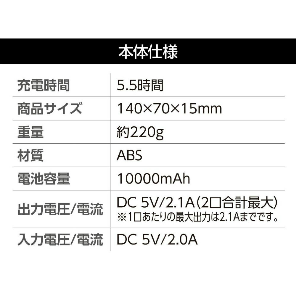 ※こちらの商品は受注発注商品の為、ご注文後4〜7営業日(土日祝日・長期休暇を除く)後の出荷予定となります。※メーカー在庫切れ等により7営業日以内に出荷できない場合はメールにてご案内させていただきます。※受注発注商品の為、ご注文後のキャンセル・返品等はメーカーへの返送料を実費ご負担頂きます。 ◆主な特長急速充電対応の大容量モバイルバッテリー本体への充電はMicroB、Type Cのどちらでも可能スマホの2台同時充電可能●電池容量/10000mAh ●出力電流/電圧:DC 5V/2.0A(最大2.1A)●入力電流/電圧:DC 5V/2.0A◆商品仕様商品名モバイルバッテリー10000mAhメーカー品番52022JAN4521718520223商品サイズ140×70×15mm素材ABS商品内容本体、充電用USBケーブル A - MicroB(長さ約290mm)衛生用品充電器