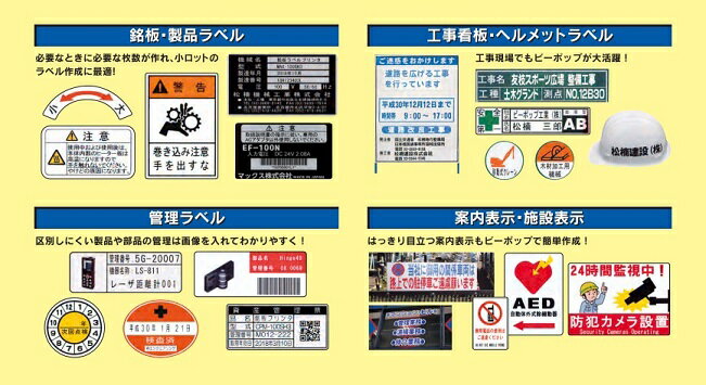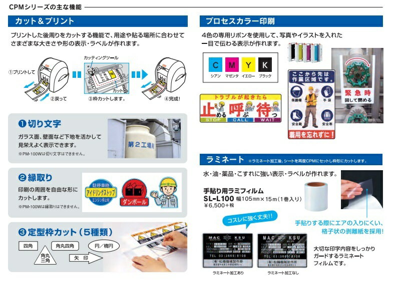 マックス製のフリ−カット ラベルプリンタ”ビ−ポップ”のCPM-200(20cm幅の表示が作成可能幅広モデル)です。 特徴 ●20cm幅の表示が作成可能な幅広モデル A4サイズで作成可能!写真も切り文字もおまかせ! ・最大印字長2mの長尺印刷が可能 最大作画範囲:20cmX2m ●写真やイラスト入りの表示物が作成可能! 目で見て分かる!見える化を推進する表示物がビーポップで作成できる。 ・プロセスカラ−印刷 4色のにプロセスカラ−専用リボン(シアン・マゼンタ・イエロ−・ブラック)を使い、 色鮮やかなカラ−印刷が可能に。今までにない写真・イラスト+文字の表示物を 様々な場面でご活用ください。 ●プリント+カッテイングの複合機能で様々なラベル・切り文字がスグ!カンタン! プリントした後周りをカットする機能で、 用途や貼る位置に合わせてさまざまな大きさや形の表示・ラベルが作れます。 プリントして→戻って→枠カットします→完成! 1、切り文字 ガラス面、壁面など下地を活かして見栄えよく表示できます。 2、縁取り 印刷の周囲を自由な形にカットします。 3、5種類の枠カット 四角、角丸四角、角丸三角、円/楕円、矢印 ●分割印字 分割作画で最大190mmサイズの文字が印刷できます。 ●インクリボンシ−トの残量が確認できます! シ−トの脇にある基準穴と残量確認穴でシートの残量が確認できます。 詳しくはシート個箱に表示された残量確認方法をご参照ください。 ●1枚からすぐに作成!ラミネ−トパウチよりカンタン・しっかり! ・ラミネ−ト 水・油・薬品・こすれに強い表示・ラベルが作れます。 ※ラミネ−ト加工後・シートを再度CPMにセットし、枠型にカットします。 ・手張り用ラミフィルム:SL-L100(幅105mmx15m/別売) 手張りする際に気泡の入りにくい格子状の剥離紙を採用! コスレに強く丈夫!! 大切な印字内容をしっかりガードするラミネ−トフィルムです。 ●その他利点 ・ロットに関係なく、1枚から作成できます。 ・ロゴ、イラスト、外国語等を使ったオリジナルのレイアウトが作成できます。 ・必要な大きさ、形にカットすることができます。 ●専用ソフト「BepopPC EX」 ・windows10/8.1/8/7 ・Bepop PC EX付属 ■ラベルの連続配置 ラベルをシート上に、無駄なく自動で連続配置します。 ■バーコ−ド 1、QRコード 2、EAN-13(JAN-13) 3、EAN-8(JAB-8) 4、UPC-A 5、UPC-E 6、IFT(Interleaveed2of5) 7、CODE39 8、CODABAR 9、CODE128 10、EAN-128 ※QRコードは、株式会社デンソ−ウエーブの登録商標です。 ■データ取り込み JPEG、BMP形式のデータを専用のアウトラインデータに変換し、 オリジナルロゴ・シンボルとして保存・修正・出力します。 ■イラストマーク・ピクトサイン・テンプレ−ト多数搭載! 各種シンボルマ−ク、公共施設、ピクトサイン等の図記号を多数内蔵。 交通エコロジ−・モビリテイ財団「標準案内用図記号」、ISO7010、SEM規格などを採用しています。 ■外国語表示機能 Unicodeに対応、海外向け製品ラベル・外国人向け案内表示も作成できます。 ※各言語に対応するTrue Typeフォントをご用意ください。 ■連番印刷 連番を指定した条件で、自動で連番印刷できます。 ■データベースリンク CSV形式やテキスト形式のデータとレイアウトファイルをリンクさせて、 可変情報の差し込み式印刷が可能。既存の製品リストや台帳を活用してラベル印刷ができます。 ■DXF形式のデータをインポ−ト プリント/ラベルのみ ※取り込むことのできるバージョンは「R12」「R13」ですが、 100%の変換率変換精度を保証するものではありません。 ●商品仕様 ■印字方式 :熱転写方式 ■印字密度 :300dpi ■印字速度 :25mm/sec ■カッティング部分解能:0.025mm/ step ■カッティング機能 :プロセスカラー印刷・切り文字・縁取り・枠カット ■最大作画範囲 :200x2,000mm ■インターフェイス :USBポート×1(Ver.2.0フルスピード) :LANポート×1(100baseTX) ■電源 :AC100V 50/60Hz ■消費電力 :150W ■使用環境 :温度:10〜35℃/湿度:35〜80%(但し結露しないこと) 湿度60%以上は27℃以下を推奨※ ■外形寸法 :H317×W425×D315(mm) ■質量 :15.5kg(本体のみ) ■付属品 ソフトウェアCD、ピンセット、スキージ、スパナ、カッタ刃(替刃)、カッタホルダ、 インストールマニュアル兼取扱説明書、お客様登録カード兼保証書、ソフトウェア使用許諾書、 電源ケーブル、USBケーブル ※ラミネートリボンをご使用の場合、一回の総印刷長さは2m以内となります。 ※高温多湿環境下でのご使用は避けて下さい。 ※消耗品によっては使用環境が変わることがあります。 ●本機及び添付ソフトが動作する環境は、次の通りです。 【コンピュータ】DOS/V機専用 【OS】Windows 10(32/64bit版)/Windows 8.1(32/64bit版)/Windows 8(32/64bit版)/7(32/64bit版) 【CPU・メモリ・HDD】上記日本語版OSが推奨するスペック以上であること。 【その他】CD-ROMドライブが使用できること 。USBポートが使用できること。 ※使用環境によってはUSBハブを経由すると正常に動作しない場合がございます。 ※動作環境はOSにより異なります。 ※Windowsは米国 Microsoft Corporationの米