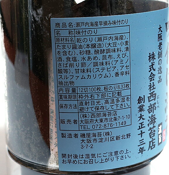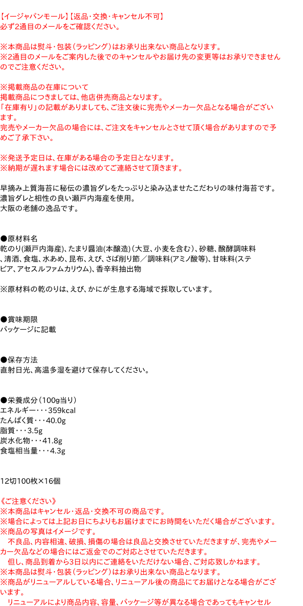 【イージャパンモール】【返品・交換・キャンセル不可】 必ず2通目のメールをご確認ください。 ※本商品は熨斗・包装(ラッピング)はお承り出来ない商品となります。 ※2通目のメールをご案内した後でのキャンセルやお届け先の変更等はお承りできませんのでご注意ください。※商品はご注文(ご決済)後、3-5営業日で発送(土・日・祝日除く)となります。※配送業者と契約がないため、送付先が北海道・沖縄・離島の場合キャンセルとさせていただきます。※送付先が東北の場合別途300円の送料を加算させていただきます。※掲載商品の在庫について 掲載商品につきましては、他店併売商品となります。 「在庫有り」の記載がありましても、ご注文後に完売やメーカー欠品となる場合がございます。 完売やメーカー欠品の場合には、ご注文をキャンセルとさせて頂く場合がありますので予めご了承下さい。 ※発送予定日は、在庫がある場合の予定日となります。 ※納期が遅れます場合には改めてご連絡させて頂きます。早摘み上質海苔に秘伝の濃旨ダレをたっぷりと染み込ませたこだわりの味付海苔です。 濃旨ダレと相性の良い瀬戸内海産を使用。 大阪の老舗の逸品です。 ●原材料名 乾のり(瀬戸内海産)、たまり醤油(本醸造)(大豆、小麦を含む)、砂糖、醗酵調味料、清酒、食塩、水あめ、昆布、えび、さば削り節/調味料(アミノ酸等)、甘味料(ステビア、アセスルファムカリウム)、香辛料抽出物 ※原材料の乾のりは、えび、かにが生息する海域で採取しています。 ●賞味期限 パッケージに記載 ●保存方法 直射日光、高温多湿を避けて保存してください。 ●栄養成分(100g当り) エネルギー・・・359kcal たんぱく質・・・40.0g 脂質・・・3.5g 炭水化物・・・41.8g 食塩相当量・・・4.3g 12切100枚×16個【メーカー・製造または販売元】株式会社西部海苔店072-876-1149【広告文責】株式会社イージャパンアンドカンパニーズ 072-875-6666《ご注意ください》 ※本商品はキャンセル・返品・交換不可の商品です。 ※場合によっては上記お日にちよりもお届けまでにお時間をいただく場合がございます。 ※商品の写真はイメージです。 不良品、内容相違、破損、損傷の場合は良品と交換させていただきますが、完売やメーカー欠品などの場合にはご返金でのご対応とさせていただきます。 但し、商品到着から3日以内にご連絡をいただけない場合、ご対応致しかねます。 ※本商品は熨斗・包装(ラッピング)はお承り出来ない商品となります。 ※商品がリニューアルしている場合、リニューアル後の商品にてお届けとなる場合がございます。 リニューアルにより商品内容、容量、パッケージ等が異なる場合であってもキャンセル・返品・交換はお承りしておりません。 ※ご注文後、完売やメーカー欠品等の場合には該当商品をキャンセルとさせていただく場合がありますので予めご了承ください。[関連キーワード:食品 海藻 味付けのり ノリ ごはん トッピング]