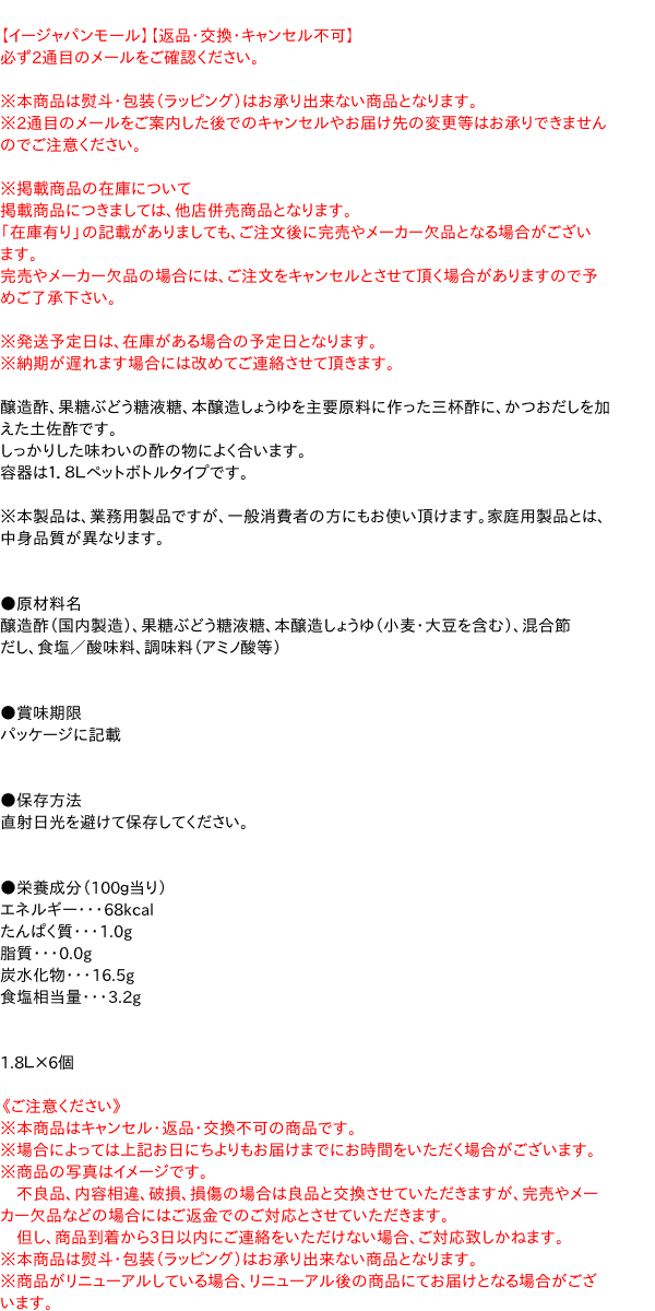 【イージャパンモール】【返品・交換・キャンセル不可】 必ず2通目のメールをご確認ください。 ※本商品は熨斗・包装(ラッピング)はお承り出来ない商品となります。 ※2通目のメールをご案内した後でのキャンセルやお届け先の変更等はお承りできませんのでご注意ください。※商品はご注文(ご決済)後、3-5営業日で発送(土・日・祝日除く)となります。※配送業者と契約がないため、送付先が北海道・沖縄・離島の場合キャンセルとさせていただきます。※送付先が東北の場合別途300円の送料を加算させていただきます。※掲載商品の在庫について 掲載商品につきましては、他店併売商品となります。 「在庫有り」の記載がありましても、ご注文後に完売やメーカー欠品となる場合がございます。 完売やメーカー欠品の場合には、ご注文をキャンセルとさせて頂く場合がありますので予めご了承下さい。 ※発送予定日は、在庫がある場合の予定日となります。 ※納期が遅れます場合には改めてご連絡させて頂きます。醸造酢、果糖ぶどう糖液糖、本醸造しょうゆを主要原料に作った三杯酢に、かつおだしを加えた土佐酢です。 しっかりした味わいの酢の物によく合います。 容器は1.8Lペットボトルタイプです。 ※本製品は、業務用製品ですが、一般消費者の方にもお使い頂けます。家庭用製品とは、中身品質が異なります。 ●原材料名 醸造酢(国内製造)、果糖ぶどう糖液糖、本醸造しょうゆ(小麦・大豆を含む)、混合節だし、食塩/酸味料、調味料(アミノ酸等) ●賞味期限 パッケージに記載 ●保存方法 直射日光を避けて保存してください。 ●栄養成分(100g当り) エネルギー・・・68kcal たんぱく質・・・1.0g 脂質・・・0.0g 炭水化物・・・16.5g 食塩相当量・・・3.2g 1.8L×6個【メーカー・製造または販売元】株式会社ミツカン0120-243636【広告文責】株式会社イージャパンアンドカンパニーズ 072-875-6666《ご注意ください》 ※本商品はキャンセル・返品・交換不可の商品です。 ※場合によっては上記お日にちよりもお届けまでにお時間をいただく場合がございます。 ※商品の写真はイメージです。 不良品、内容相違、破損、損傷の場合は良品と交換させていただきますが、完売やメーカー欠品などの場合にはご返金でのご対応とさせていただきます。 但し、商品到着から3日以内にご連絡をいただけない場合、ご対応致しかねます。 ※本商品は熨斗・包装(ラッピング)はお承り出来ない商品となります。 ※商品がリニューアルしている場合、リニューアル後の商品にてお届けとなる場合がございます。 リニューアルにより商品内容、容量、パッケージ等が異なる場合であってもキャンセル・返品・交換はお承りしておりません。 ※ご注文後、完売やメーカー欠品等の場合には該当商品をキャンセルとさせていただく場合がありますので予めご了承ください。[関連キーワード:調味料 酢 す とさ酢 酢の物 和え物 合わせ酢 業務用]