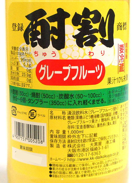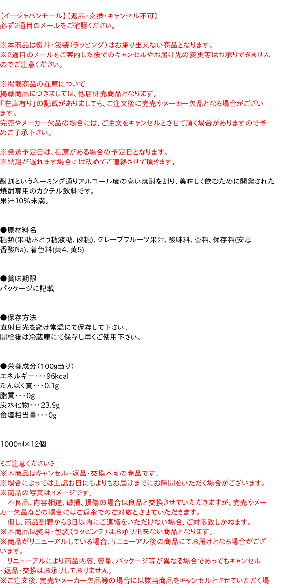 【イージャパンモール】【返品・交換・キャンセル不可】 必ず2通目のメールをご確認ください。 ※本商品は熨斗・包装(ラッピング)はお承り出来ない商品となります。 ※2通目のメールをご案内した後でのキャンセルやお届け先の変更等はお承りできませんのでご注意ください。※商品はご注文(ご決済)後、3-5営業日で発送(土・日・祝日除く)となります。※配送業者と契約がないため、送付先が北海道・沖縄・離島の場合キャンセルとさせていただきます。※送付先が東北の場合別途300円の送料を加算させていただきます。※掲載商品の在庫について 掲載商品につきましては、他店併売商品となります。 「在庫有り」の記載がありましても、ご注文後に完売やメーカー欠品となる場合がございます。 完売やメーカー欠品の場合には、ご注文をキャンセルとさせて頂く場合がありますので予めご了承下さい。 ※発送予定日は、在庫がある場合の予定日となります。 ※納期が遅れます場合には改めてご連絡させて頂きます。酎割というネーミング通りアルコール度の高い焼酎を割り、美味しく飲むために開発された焼酎専用のカクテル飲料です。 果汁10%未満。 ●原材料名 糖類(果糖ぶどう糖液糖、砂糖)、グレープフルーツ果汁、酸味料、香料、保存料(安息香酸Na)、着色料(黄4、黄5) ●賞味期限 パッケージに記載 ●保存方法 直射日光を避け常温にて保存して下さい。 開栓後は冷蔵庫にて保存し早くご使用下さい。 ●栄養成分(100g当り) エネルギー・・・96kcal たんぱく質・・・0.1g 脂質・・・0g 炭水化物・・・23.9g 食塩相当量・・・0g 1000ml×12個【メーカー・製造または販売元】株式会社大黒屋0120-17-6363【広告文責】株式会社イージャパンアンドカンパニーズ 072-875-6666《ご注意ください》 ※本商品はキャンセル・返品・交換不可の商品です。 ※場合によっては上記お日にちよりもお届けまでにお時間をいただく場合がございます。 ※商品の写真はイメージです。 不良品、内容相違、破損、損傷の場合は良品と交換させていただきますが、完売やメーカー欠品などの場合にはご返金でのご対応とさせていただきます。 但し、商品到着から3日以内にご連絡をいただけない場合、ご対応致しかねます。 ※本商品は熨斗・包装(ラッピング)はお承り出来ない商品となります。 ※商品がリニューアルしている場合、リニューアル後の商品にてお届けとなる場合がございます。 リニューアルにより商品内容、容量、パッケージ等が異なる場合であってもキャンセル・返品・交換はお承りしておりません。 ※ご注文後、完売やメーカー欠品等の場合には該当商品をキャンセルとさせていただく場合がありますので予めご了承ください。[関連キーワード:飲料 清涼飲料 ぐれーぷふるーつ 希釈 柑橘系 酎ハイ 炭酸割り カクテル 業務用]