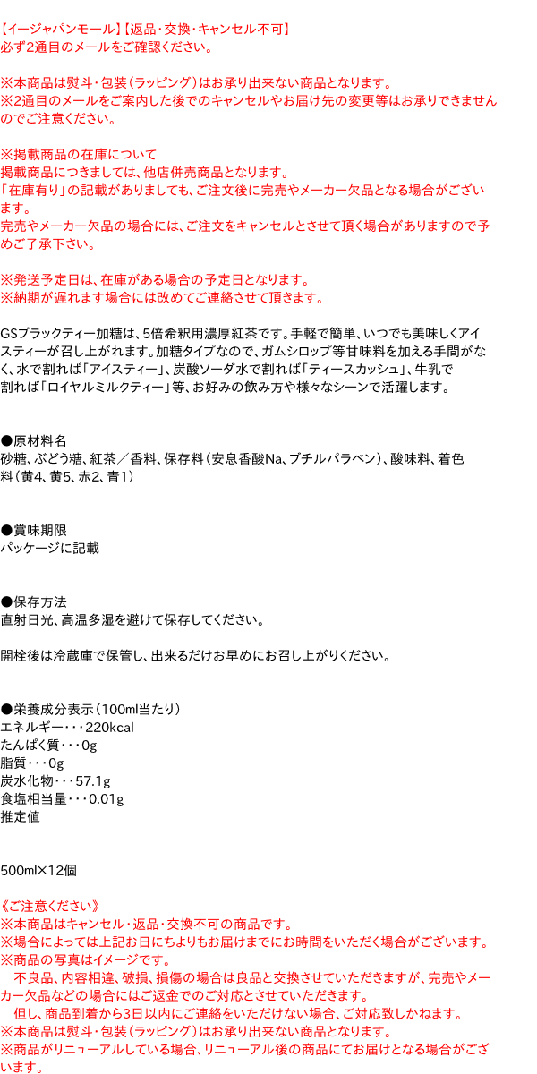 【イージャパンモール】【返品・交換・キャンセル不可】 必ず2通目のメールをご確認ください。 ※本商品は熨斗・包装(ラッピング)はお承り出来ない商品となります。 ※2通目のメールをご案内した後でのキャンセルやお届け先の変更等はお承りできませんのでご注意ください。※商品はご注文(ご決済)後、3-5営業日で発送(土・日・祝日除く)となります。※配送業者と契約がないため、送付先が北海道・沖縄・離島の場合キャンセルとさせていただきます。※送付先が東北の場合別途300円の送料を加算させていただきます。※掲載商品の在庫について 掲載商品につきましては、他店併売商品となります。 「在庫有り」の記載がありましても、ご注文後に完売やメーカー欠品となる場合がございます。 完売やメーカー欠品の場合には、ご注文をキャンセルとさせて頂く場合がありますので予めご了承下さい。 ※発送予定日は、在庫がある場合の予定日となります。 ※納期が遅れます場合には改めてご連絡させて頂きます。GSブラックティー加糖は、5倍希釈用濃厚紅茶です。手軽で簡単、いつでも美味しくアイスティーが召し上がれます。加糖タイプなので、ガムシロップ等甘味料を加える手間がなく、水で割れば「アイスティー」、炭酸ソーダ水で割れば「ティースカッシュ」、牛乳で割れば「ロイヤルミルクティー」等、お好みの飲み方や様々なシーンで活躍します。 ●原材料名 砂糖、ぶどう糖、紅茶/香料、保存料(安息香酸Na、ブチルパラベン)、酸味料、着色料(黄4、黄5、赤2、青1) ●賞味期限 パッケージに記載 ●保存方法 直射日光、高温多湿を避けて保存してください。 開栓後は冷蔵庫で保管し、出来るだけお早めにお召し上がりください。 ●栄養成分表示(100ml当たり) エネルギー・・・220kcal たんぱく質・・・0g 脂質・・・0g 炭水化物・・・57.1g 食塩相当量・・・0.01g 推定値 500ml×12個【メーカー・製造または販売元】株式会社ジーエスフード06-6744-1551【広告文責】株式会社イージャパンアンドカンパニーズ 072-875-6666《ご注意ください》 ※本商品はキャンセル・返品・交換不可の商品です。 ※場合によっては上記お日にちよりもお届けまでにお時間をいただく場合がございます。 ※商品の写真はイメージです。 不良品、内容相違、破損、損傷の場合は良品と交換させていただきますが、完売やメーカー欠品などの場合にはご返金でのご対応とさせていただきます。 但し、商品到着から3日以内にご連絡をいただけない場合、ご対応致しかねます。 ※本商品は熨斗・包装(ラッピング)はお承り出来ない商品となります。 ※商品がリニューアルしている場合、リニューアル後の商品にてお届けとなる場合がございます。 リニューアルにより商品内容、容量、パッケージ等が異なる場合であってもキャンセル・返品・交換はお承りしておりません。 ※ご注文後、完売やメーカー欠品等の場合には該当商品をキャンセルとさせていただく場合がありますので予めご了承ください。[関連キーワード:飲料 ブラックティー 加糖 希釈 濃厚 紅茶 手軽 簡単 業務用]
