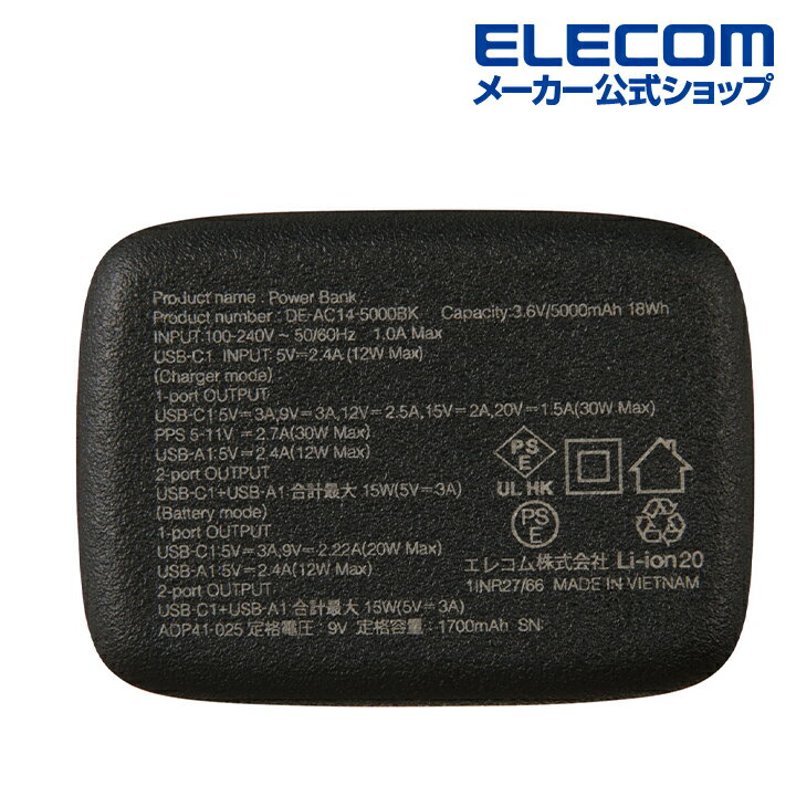 エレコム モバイルバッテリー AC充電器 一体 5000mAh 30W C×1+A×1 リチウムイオン電池 USB Power Delivery対応 USB-C入出力 USB-A出力 PSE適合 ブラック ELECOM DE-AC14-5000BK