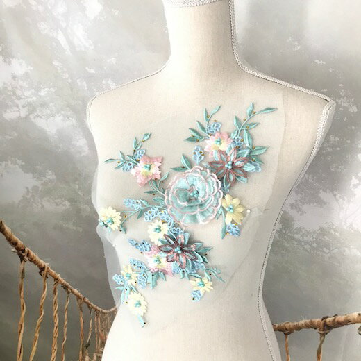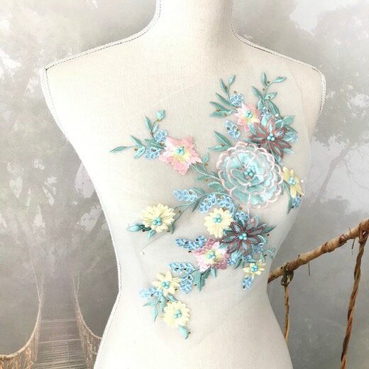 花柄のエレガントなビーズ・ストーン付き、 立体的な刺繍チュールモチーフです。 切り離してお好みに合わせてデザインができます♪ 社交ダンス、バトントワリング、レオタード、 ベリーダンス、フィギュアスケート、バレエ、ドレス、 ステージ衣装、ハンドメイド材料などに使用すると お洒落感がワンランクアップします。 サイズ:H37cm W25cm カラー:ライトブルー・ミントグリーン・ピンク系