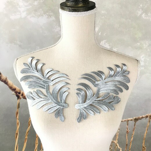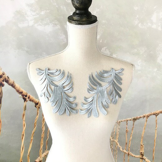 アイロン接着できるシルバーリーフの刺繍モチーフセットです。 お洋服、ドレス、舞台衣装、バレエコスチューム、 小物、バトントワリング、レオタード、ドレス、 ステージ衣装などにお使い頂けます。 ※ アイロン接着or縫い付けも可能 サイズ:H19cm W12cm カラー:シルバー 左右セット アイロン接着できます。 140℃〜160℃位で圧着してください。 熱が冷えるまで動かさないでください。