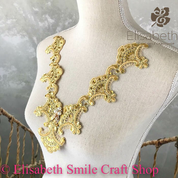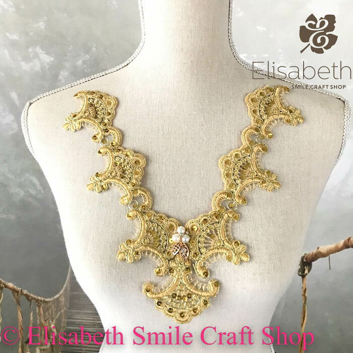 ビーズ付きネックラインチュールモチーフになります。 各種イベント、社交ダンス、ドレス、ステージ衣装、 舞台衣装、新体操、バトントワリング、レオタード、 演劇、ミュージカル、ベリーダンス、フィギュアスケート、 バレエ衣装、ウェディング、パーティーなど、 手作り制作など縫い付けるだけで個性的な仕上がりになります。 サイズ:H26cm W25cm カラー:ゴールド系 ※当店のオリジナルデザインとなります。