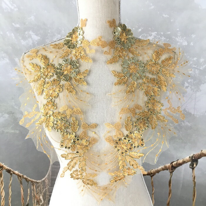 ゴールドのスパンコール付きチュールモチーフになります。 各種イベント、社交ダンス、ドレス、ステージ衣装、 舞台衣装、新体操、バトントワリング、レオタード、 演劇、ミュージカル、ベリーダンス、フィギュアスケート、 バレエ衣装、ウェディング、パーティーなど、 用途に合わせて楽しめるお洒落なアイテムです。 サイズ:H40cm W24cm カラー:ゴールド 左右セット