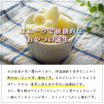 「北海道・沖縄・離島・一部地域へのお届けは別途送料を請求させていただきます。」「お客様都合でのキャンセルの場合、出荷前後にかかわらずキャンセル料などの手数料が発生いたしますので予めご了承ください。」「メーカーより取り寄せ商品のため、在庫状況によっては欠品・廃盤の可能性があります。あらかじめご了承ください。」100%ナチュラル原料の愛犬用ジェラート。暑い日の体温調節や食欲不振のわんちゃんにオススメ。作り方カップに水 (約80ml) を加え、フタをしっかりと閉め、全体が混ざるまで約30秒間振ってください。その後、冷凍庫で約3時間休ませます。 アイスは冷凍庫で保存し、10日以内にお召し上がりください。本製品1個(40g)で約120gのジェラートが作れます。※製品は直射日光を避け涼しく乾燥した場所にそのまま保管してください。※推奨量を超えると、お腹が緩くなる可能性があります。サイズ個装サイズ:5×5×15cm重量個装重量:35g仕様給与量目安:小型60g/中型120g/大型180g賞味期間:製造日より720日生産国イタリア栄養成分エネルギー:144kcal/個粗タンパク質 8.8%、粗脂肪 7.2%、粗繊維 2.1%、粗灰分 3%原材料果糖、ホエイ、スキムミルク、植物性脂肪 (パーム、ココナッツ)、バターミルク、小麦粉、ブドウ糖、コーンスターチ、炭酸カルシウム、重炭酸ナトリウム、マンナンオリゴ糖、塩化ナトリウム、酸化マグネシウム、リン酸一カリウム、アップルパウダー、クロレラ、ビタミンEfk094igrjs