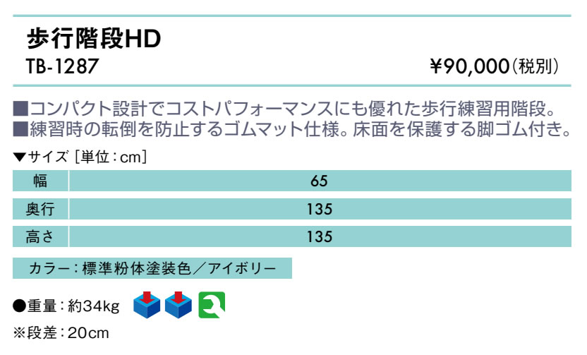 製品の仕様 重量 約34kg 幅 65cm 長さ 135cm 高さ 135cm 強度レベル(メーカー指標 5段階) 1つのアイコンに対し製品強度(等分布荷重)は100kgです。 組立の有無 組立必要(スパナ付属) 配送について 大型商品(大型宅配便)について お届けは玄関の前まで、ビルやマンションの場合は共同玄関口までの配達となります。配達員は1名でお伺いをいたしますので、トラックからの荷下ろし、 搬入が困難な場合、お客様にお手伝いをお願いしております。 再配達について 路線便での配送となるため、不在時の持ち帰りや再配達の際に別途費用が発生します。ご不明な点はお問い合わせください。 搬入・設置組立について 時間指定や階段を利用しての搬入、設置組立をご希望の場合も別途費用が発生します。必要な場合は予めご相談ください。 個人宅への配送について ご注文時の備考欄に(施設名・屋号・予定名称)をご記入ください。お届け先が個人様宛の場合、別途送料が必要です。 北海道・沖縄・離島へのお届けについて 追加送料が発生します。法人様につきましても追加送料分のご負担が必要です。 サポート情報 ※メーカー希望小売価格はメーカーカタログに基づいて掲載しています。TB-1287 歩行階段HD コンパクト設計でコストパフォーマンスにも優れた歩行練習用階段。練習時の転倒を防止するゴムマット仕様。床面を保護する脚ゴム付き。お二人以上での組立をおすすめします。※組立時間:約20〜40分。※段差:20cm。 高田ベッド製作所正規特約店のエンバシーで安心をプラス! 関連商品はこちら(孔加工の有無やサイズ違い、オプションなど) 歩行階段SD ご注文はこちらから