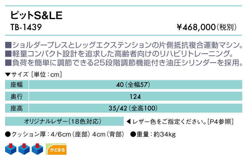 製品の仕様 クッション厚 4/6cm(座部) 4cm(背部) 重量 約34kg 幅 40cm(全幅57cm) 奥行 124cm 座高 35/42cm(全高100cm) 組立の有無 組立済み 強度レベル(メーカー指標 5段階) 1つのアイコンに対し製品強度(等分布荷重)は100kgです。 配送について 大型商品(大型宅配便)について お届けは玄関の前まで、ビルやマンションの場合は共同玄関口までの配達となります。配達員は1名でお伺いをいたしますので、トラックからの荷下ろし、 搬入が困難な場合、お客様にお手伝いをお願いしております。 再配達について 路線便での配送となるため、不在時の持ち帰りや再配達の際に別途費用が発生します。ご不明な点はお問い合わせください。 搬入・設置組立について 時間指定や階段を利用しての搬入、設置組立をご希望の場合も別途費用が発生します。必要な場合は予めご相談ください。 個人宅への配送について ご注文時の備考欄に(施設名・屋号・予定名称)をご記入ください。お届け先が個人様宛の場合、別途送料が必要です。 北海道・沖縄・離島へのお届けについて 追加送料が発生します。法人様につきましても追加送料分のご負担が必要です。 サポート情報 ※メーカー希望小売価格はメーカーカタログに基づいて掲載しています。TB-1439 ピットS&LE ショルダープレスとレッグエクステンションの片側抵抗複合運動マシン。軽量コンパクト設計を追求した高齢者向けのリハビリトレーニング。負荷を簡単に調節できる25段階調節機能付き油圧シリンダーを採用。 レザーカラーは18色のオリジナルレザーからお選びいただけます。 メディカル専用に開発された5つの特性を持つ高耐久ビニルレザーです。 フレーム塗装に粉体塗装を採用!木材は全てF☆☆☆☆で安全安心です。 高田ベッド製作所正規特約店のエンバシーで安心をプラス! ご注文はこちらから