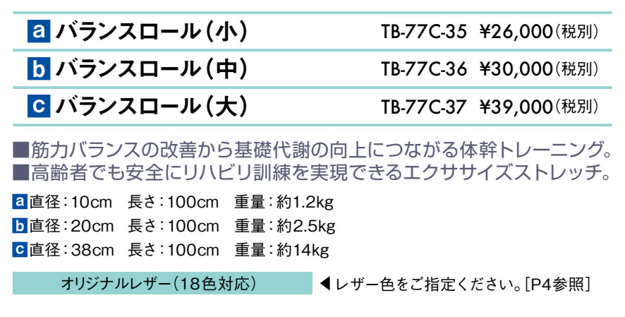 製品の仕様 サイズ 直径20×長さ100cm 約2.5kg 配送について 大型商品(大型宅配便)について お届けは玄関の前まで、ビルやマンションの場合は共同玄関口までの配達となります。配達員は1名でお伺いをいたしますので、トラックからの荷下ろし、 搬入が困難な場合、お客様にお手伝いをお願いしております。 再配達について 路線便での配送となるため、不在時の持ち帰りや再配達の際に別途費用が発生します。ご不明な点はお問い合わせください。 搬入・設置組立について 時間指定や階段を利用しての搬入、設置組立をご希望の場合も別途費用が発生します。必要な場合は予めご相談ください。 個人宅への配送について ご注文時の備考欄に(施設名・屋号・予定名称)をご記入ください。お届け先が個人様宛の場合、別途送料が必要です。 北海道・沖縄・離島へのお届けについて 追加送料が発生します。法人様につきましても追加送料分のご負担が必要です。 サポート情報 ※メーカー希望小売価格はメーカーカタログに基づいて掲載しています。TB-77c-36 バランスロール(中) 長さ1mのロングサイズ多目的クッションです。 レザーカラーは18色のオリジナルレザーからお選びいただけます。 メディカル専用に開発された5つの特性を持つ高耐久ビニルレザーです。 高田ベッド製作所正規特約店のエンバシーで安心をプラス! ご注文はこちらから