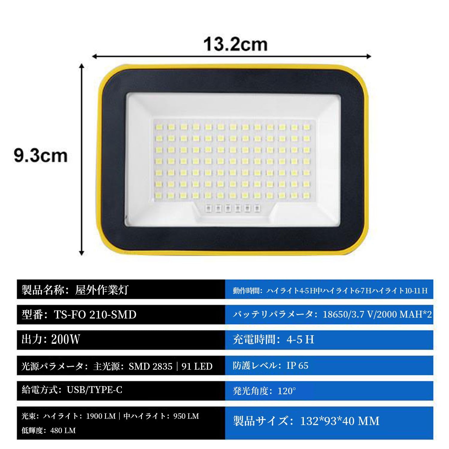 LED投光器 200W 充電式 96LED 大容量電池搭載 ポータブル投光器 LED作業灯 集魚灯 テントライト 昼白色 IP65防水 防災対策 夜間作業 夜釣り 軽量