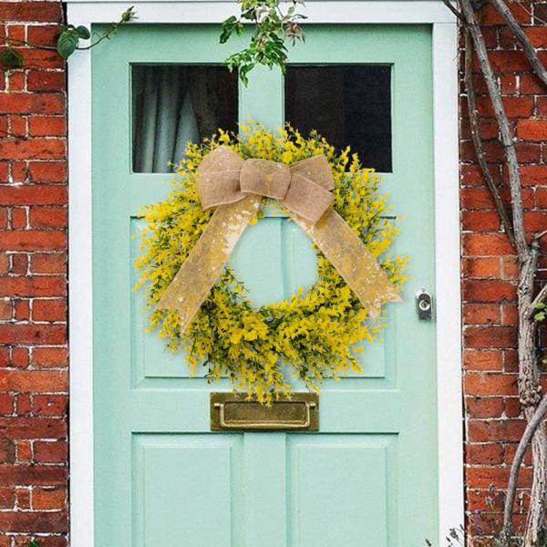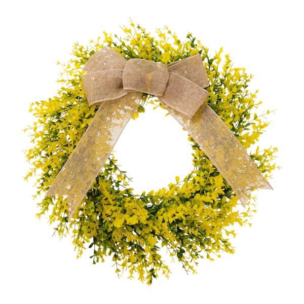 葉のリースの人工リース、リアルな35cm、黄麻布のリボン付き、春のリースのガーランド、玄関のリース、庭、家のインテリア用