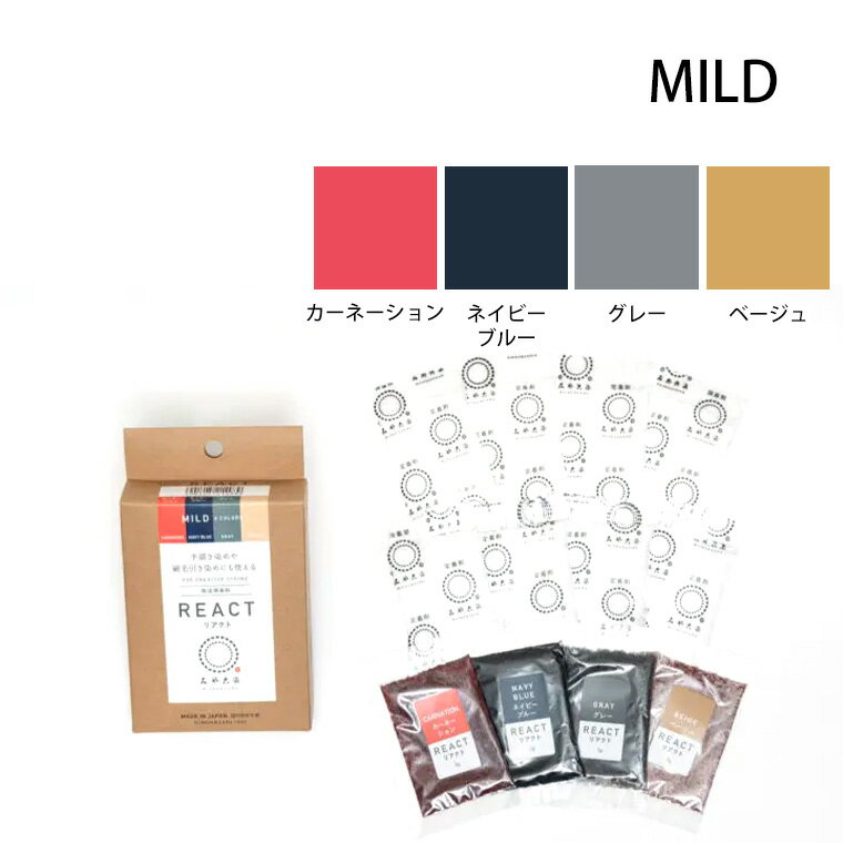 商品について 商品名 技法用染料 リアクト 4色セット 商品説明 浸し染め・手描き染めと色々な技法が楽しめる染料です。色鮮やかで短時間に発色するため、タイダイ染めにも最適です。 綿・麻・レーヨン等植物繊維用ですが、熱湯は必要なく、また染色後の色止めも必要ない為、とても手軽な染料です。 刷毛引き染めや手描き染めを行う際には別売の「手描き染め用定着剤」を、にじみを避ける為には、別売の「にじみ防止剤」をご利用ください。 カラー LIGHT:イエロー・スカイブルー・チェリーピンク・オレンジの明るい色合い MILD:カーネーション・ネイビーブルー・グレー・ベージュの落ち着いた色合い VIVID:ルージュ・パープル・ブリリアントブルー・グリンの鮮やかな色合い 内容 染料5g×4包、定着剤10g×8包、説明書 染色温度表記 中温 染まるもの ・浸し染めの場合:1色につき50gの繊維 ・刷毛引き染めの場合:45cm角(ハンカチ)約1〜3枚 ◎よく染まる:綿、麻、レーヨン等 原産国 日本製 発売元 桂屋ファイングッズ株式会社 備 考 ※画像は閲覧環境により実際のお色と異なる場合がございます。 ※パッケージのデザインは予告なく変更になる場合がございます。 関連商品 手描き染め用定着剤 にじみ防止剤 リアクト 単色