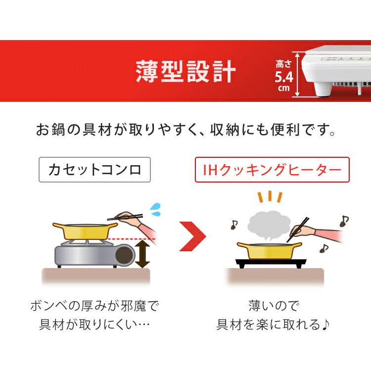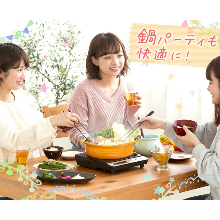卓上で料理の保温から揚げ物まで多用途に使える簡単・便利なIHコンロです。 最大火力1000Wのハイパワーと、2種類のモード(加熱・揚げ物)で、料理の幅が広がります。 低騒音化設計で気になる運転音を抑えて静かに調理ができます。 カセットコンロと使用感は変わらず経済的です。 IHコンロは熱効率が良いから光熱費の削減が出来て経済的です。 掃除がしやすい、ガラストップを採用しています。 吹きこぼれがあってもサッとふき取るだけの簡単お手入れ。 火を使わないので空気を汚さず一酸化炭素中毒の危険がありません。 コードに足や手を引っ掛けてもコードだけ外れるマグネットコードを採用。小さなお子様がいるご家庭でも安心です。 【5つの安全機能】 ・なべ検知機能 ・鍋なし自動OFF ・小物検知機能 ・切り忘れ自動OFF ・温度過上昇防止機能●商品サイズ(cm)幅約24×奥行約28.6×高さ約5.4 ●本体重量約1.7kg ●電源 AC100V(50/60Hz) ●定格消費電力 1000W ●電源コード長さ 約1.5m ●ヒーター IHヒーター 1000W ●火力調節 加熱調理:5段階(火力)80W相当〜1000W 揚げ物調理:5段階(油温)約160〜約200℃ 【使えるなべ】 ・材質 鉄・鉄鋳物、鉄ほうろう、ステンレス、多層鋼なべ※種類によっては発熱しないことがあります。 ・大きさ 加熱調理の場合:直径12〜20cmのもの 揚物調理の場合:直径18〜20cmのもの ・形状:底の平らなもの 揚げ物調理:反りが1mm以下のもの 加熱調理の場合:反りが3mm以下のもの ※特に揚物調理の時は、底に凹凸模様などのない鍋を使用してください。 【使えないなべ】 ・材質 耐熱ガラス、陶磁器・土なべ、アルミ・銅 ・大きさ 直径12cm未満のもの トッププレートの鍋の目安からはみ出すサイズのもの ・形状 中華なべなど底が丸いもの 底に段がありトッププレートに密着しないもの 底に脚があるもの ※IH調理器では、材質や大きさにより使える鍋と使えない鍋があります。 使用する鍋は、財団法人「製品安全協会」のSGマークのあるものをお勧めします。 (検索用:IHコンロ IHクッキングヒーター IH調理 調理 クッキング 電気コンロ 家電 台所 食卓 一人暮らし 安全 料理 加熱 食事 火力 鍋 ブラック 電気 テーブル 卓上 4967576373302) 最強翌日配送対象商品に関するご案内 最強翌日配送対象商品・対象地域に該当する場合は最強翌日配送マークがご注文カゴ近くに表示されます。 最強翌日配送可能なお支払方法は【クレジットカード、代金引換、全額ポイント支払い】のみとなります。 下記の場合は最強翌日配送対象外となります。 ・15点以上ご購入いただいた場合 ・時間指定がある場合 ・ご注文時備考欄にご記入がある場合 ・決済処理にお時間を頂戴する場合 ・郵便番号や住所に誤りがある場合 ・最強翌日配送対象外の商品とご一緒にご注文いただいた場合 ・お届け先住所文字数が40文字以上の場合お届け先が沖縄・離島の場合、お届け日時のご希望に沿えない場合がございます。予めご了承ください。 ご注文前のよくある質問についてご確認下さい[ FAQ ]