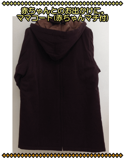 赤ちゃんとママが、お出かけするときの、コートです。赤ちゃんを、抱っこ&おんぶをしていても、着用することができるので、とっても便利。(赤ちゃん用まち付き) ●品質 : 表地:ポリエステル 100% 中わた:ポリエステル 100% 裏地:ポリエステル 100% ●サイズ 丈82×幅56×袖丈55CM ※平置き採寸 ●カラー : ブラウン ●モデル身長 165cm 着用で膝丈となりました。 ●フリーサイズ ※撮影状況やご使用のパソコン環境により、実物と多少色が異なる場合がございます。 ※必ず子守帯を使用し、着用して下さい。 ※※当ショップ定番外に付き処分価格。 ※ポイントのご案内ポイント10倍の期間中は上記のポイント倍率・ポイント数が赤字で表示されております。 ------------------------------- ※北海道・沖縄離島のお客様は、 送料が別途発生いたします。 -------------------------------寒い日のお出かけは、少々大変です。♪親子のお出かけを楽しく快適にサポートしてくれる、あたたかいママコートは とってもおすすめですよ〜♪【赤ちゃん用のまち付き】なので、 赤ちゃんを、1)抱っこ 2)おんぶ をしていても、着用することができるます。さらに、3)ママ一人 でも使える、優れモノのコートです♪