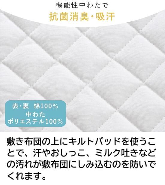 赤ちゃんの城 キルトパッド(抗菌消臭・吸汗) ■サイズ 120×70センチ ■素材 生地 (表・裏) 綿 100% (中わた)ポリエステル 100% 赤ちゃんのおしっこや、汗、吐乳、などの汚れを吸い取るのがキルトパッドです。 シーツの下にひいてお使いください。 抗菌防臭・吸汗中わたを使用していますので いつでも快適♪ ++++++++++++++++++++++++++++++++ こちらの商品は、お布団をセットする際の 必需品/おすすめのお布団です ★防水シーツ★ ★オーガニックのお布団★ ++++++++++++++++++++++++++++++++