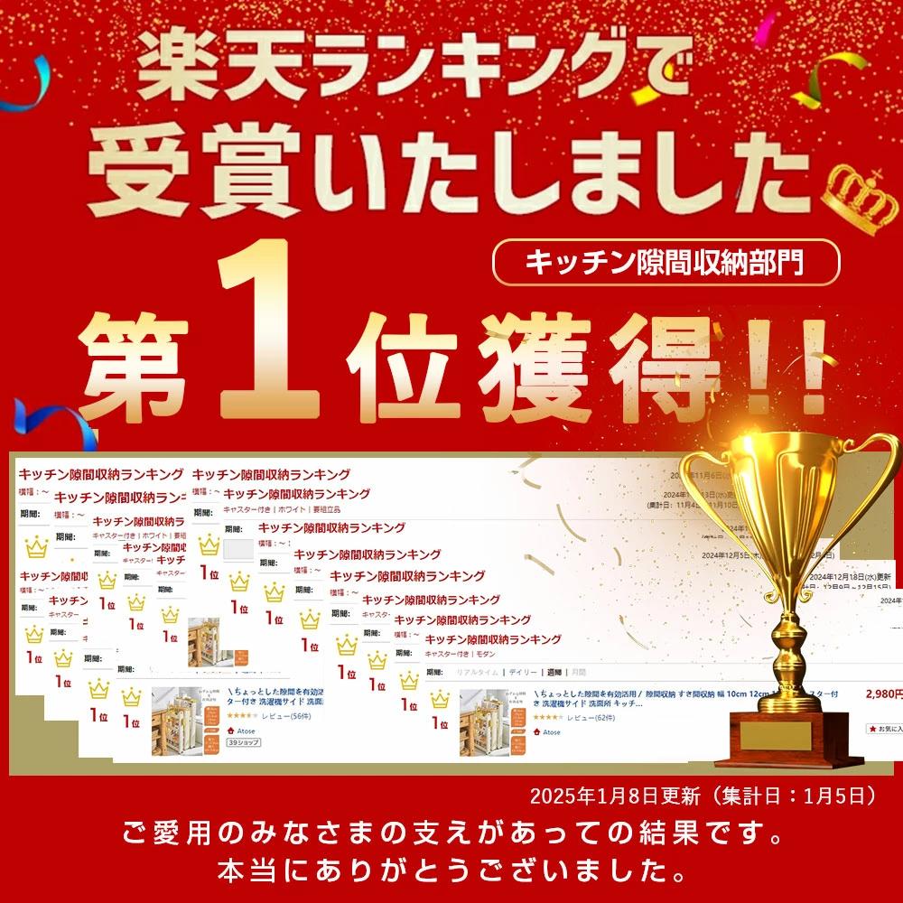 商品情報【気になる隙間を有効活用】気になる食器棚の横やレンジ台の脇など、ちょっとした隙間にスッと収納できます。いくらあっても足りないキッチンの収納スペース。スマートワゴンを使って、今までデッドスペースになっていた隙間を上手く活用してみませんか?1段につき2Lのペットボトルであれば4本も入る大満足の収納力で、スリムながらたくさんの物を収納することができます※ペットボトルのサイズや形状によって入る本数が異なる場合があります。【色んな場面で大活躍】キッチン以外でも使え、色んな場所で大活躍します。洗面所ではランドリーや洗面の隙間の収納、トイレではペーパーホルダーラックとしても使えます。プラスチック製で水に濡れてもすぐにふき取ることができるので、お掃除も簡単です。また、リビングなどでは壁面に沿わせて収納することもできます。【移動に便利なキャスター付】まっすぐに動くキャスター付きなので、引き出しの感覚で出し入れできます。【工具不要でラクラク組立】ネジもなく、工具不要で組立簡単です。はめ込むだけなので、女性一人でも簡単に組み立てることができます。関連キーワード(本商品の説明ではありません)キッチンワゴン キャスター付き シンク下 冷蔵庫横 隙間収納 奥行60 奥行80 奥行96 収納棚 キッチンラック スリム コンロ横 キッチン 収納 幅10cm 洗面所 キッチンラック すきま収納 台所収納 トイレ サニタリー 脱衣所 ランドリー シンクサイド シンク横 洗面台横 洗濯機 ランドリー収納 ランドリーラック 収納ストッカー 収納ワゴン スキマ収納 コンロ奥ラック 洗面台 リバーシブルすき間ワゴン マルチワゴン トイレ収納 バスケットトローリー キッチンストッカー ワゴン サイドワゴン 食糧庫 食料庫 スリムストレージ 隙間収納 10cm以下 幅9cm テーブル下収納 洗面台 隙間収納 10cm以下 20cm 引き出し 隙間ラック 25cm カウンター上収納 食器棚 キッチンストッカー すき間ワゴン 隙間ワゴン スリム収納 スリムラック 幅15cm ワゴンラック スライドラック 収納庫 収納棚 すき間ラック すきまラック プラスチック製 軽量 軽い 細い スマート 薄型 隙間にぴったり 省スペース 有効活用 デッドスペース 白 ホワイト グレー 無地 シンプル おすすめ オススメ 便利 コミックラック DVDラック CDラック BDラック ウッドラック 木製ラック キッチンラック ディスプレイラック コレクションラック スリムラック 幅15cm 薄型ラック オープンラック 4段ラック マルチラック ランドリーラック 収納シェルフ すき間収納 薄型収納 スリム収納 漫画収納 コミック収納 CD収納 DVD収納 リビング収納 キッチン収納 クローゼット収納 おもちゃ収納 収納棚 整理棚 本棚 書棚 木製棚 飾り棚 ディスプレイ台 段差をまたげる隙間ストッカー 収納家具 ブックワゴン 収納ワゴン 大容量 薄い 省スペース 浅い 細い 縦長 コンパクト ロー 四段 キャスター付き 取っ手付き キッチンワゴン 可動棚 絵本 飲料水 小物 ワゴン 頑丈 もらって嬉しい新築祝い ブラックフライデー 2024 ※変形や転倒の危険がありますので、一部に荷重がかかりすぎないよう、平均して乗せるようにしてください※熱による変形の恐れがありますので、ストーブ等の近くでは使用しないでください「Atose 売れ筋 TOP6」 ■「自分用にも、プレゼントにも最適!」■ ■「節電できる同時に、自然な光でお部屋を明るくする!」■ ■「あたたかなお部屋づくりをお手伝い。」■ ■「多用途に使えるスーツケースがあれば、旅はもっと楽しくなる。」■ ■「寒い冬におすすめの防寒グッズ特集」■