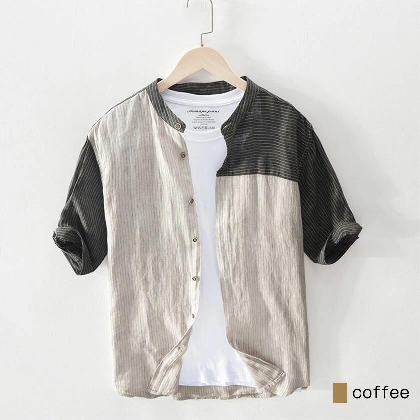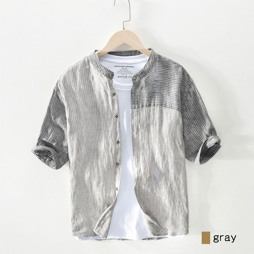 ストライプ シャツ カジュアルシャツ 半袖 シャツ メンズ バンド スタンドカラー シャツ 麻 シャツ トップス キレイ目 おしゃれ バイカラー 男 カジュアル 春 夏 メール便
