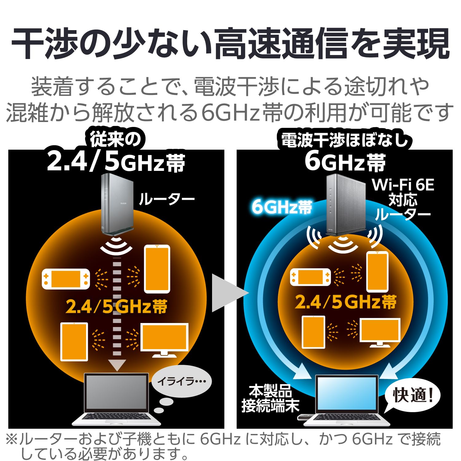 ・ブラック WDC-XE2402TU3-B・パソコンに装着することで高速な無線通信を実現するWi-Fi 6E(11ax)USB 5Gbps(USB3.0)対応2402Mbps無線LANアダプターです。・Wi-Fi 6Eから新たに解放された「6GHz帯」では、既存の2.4GHz/5GHz帯で発生していた電波干渉による途切れや混雑による通信速度の低下などの解消が見込まれ、6GHz対応ルーターと本製品を組み合わせることで、Wi-Fi使用時の困りごとを解消した快適な通信環境の構築が可能です。・高速通信の主流となった5GHz帯は航空や気象レーダーにも使用されており、干渉を防ぐためWi-Fi機器にはレーダーを検出すると5GHz帯の電波を停止するDFS機能が搭載されています。6GHz帯ではその制限がないため、DFSによる途切れからも解放されます。・※ルーターおよび子機ともに6GHzに対応し、かつ6GHzで接続している必要があります。・他の端末と同時にデータを受信・処理することができるMU-MIMO機能を搭載しています。説明 【 仕様 】 ■対応OS(Windows):Windows 11/10(Home/Pro) ■無線規格:IEEE 802.11ax/IEEE 802.11ac/IEEE 802.11n/IEEE 802.11g/IEEE 802.11b/IEEE 802.11a ■無線伝送方式:IEEE 802.11ax:MIMO-OFDMA、IEEE 802.11ac:MIMO-OFDM、IEEE 802.11n:MIMO-OFDM、IEEE 802.11g:OFDM、IEEE 802.11b:DS-SS、IEEE 802.11a:OFDM ■無線伝送速度(理論値):IEEE 802.11ax:最大2402Mbps、IEEE 802.11ac:最大867Mbps、IEEE 802.11n:最大300Mbps、IEEE 802.11g:最大54Mbps、IEEE 802.11b:最大11Mbps、IEEE 802.11a:最大54Mbps ■周波数帯域:2.4GHz帯:2 400~2 484MHz、5.2GHz帯(W52):5 150~5 250MHz、5.3GHz帯(W53):5 250~5 350MHz、5.6GHz帯(W56):5 470~5 730MHz、6GHz帯:5 925~6 425MHz ■チャンネル:2.4GHz帯:1~13ch、5GHz帯(W52/W53/W56):36/40/44/48/52/56/60/64/100/104/108/112/116/120/124/128/132/136/140/144ch、6GHz帯:1/5/9/13/17/21/25/29/33/37/41/45/49/53/57/61/65/69/73/77/81/85/89/93ch ■無線セキュリティ:WPA3 Personal(AES)/WPA2 Personal(AES)/WPA Personal(TKIP)/WEP(64bit/128bit) ※WPA3を利用する場合、WPS機能は使えません。 ※Windows 10でWPA3を使用する場合、Windows 10のバージョンを19H1以上にアップデートしてください。 ■ビームフォーミング機能:対応(Rxビームフォーミングのみ) ■MU-MIMO機能:対応 ■設定方式:WPS(ソフト方式) ※6GHzには対応していません。 ■アクセス方式:インフラストラクチャー ■アンテナ(本数):内蔵アンテナ送受信2本(2.4GHz/5GHz/6GHz共用) ■送信出力:10mW/MHz以下 ■IEEE802.1X対応方式:非対応 ■IEEE802.1X対応サプリカント:非対応 ■対応USB規格:USB 5Gbps(USB3.0)/USB2.0 ※6GHz/5GHz帯で通信する場合は十分な速度を実現するため、USB 5Gbps(USB3.0)ポートに接続してください。※2.4GHz帯で通信する場合はUSB2.0で動作します。※本製品はパソコンに直接取り付けてください。USBハブでのご使用は非対応となっています。 ■USBインターフェ-ス:USB-A ■USB伝送速度(理論値):USB 5Gbps(USB3.0):5Gbps、USB2.0:480Mbps ■入力電圧:DC 5V ■消費電力:4.5W(USB 5Gbps(USB3.0)最大)/2.5W(USB2.0最大) ■消費電流:900mA(最大) ■電源方式:USBバスパワー ■外形寸法(幅×奥行き×高さ):幅約88.0mm×奥行約28.0mm×高さ約14.0mm ■質量:約31g ■筐体材質(カラー):プラスチック(ブラック) ■動作環境:温度:0℃~40℃、湿度:10%~90%(結露なきこと) ■各種取得規格:TELEC、VCCI Class B、JATE ■法令対応:EU RoHS指令準拠(10物質) ■保証期間:1年間 ■付属品:セットアップガイド 【 説明 】 ■パソコンに装着することで高速な無線通信を実現するWi-Fi 6E(11ax)USB 5Gbps(USB3.0)対応2402Mbps無線LANアダプターです。 ■Wi-Fi 6Eから新たに解放された「6GHz帯」では、既存の2.4GHz/5GHz帯で発生していた電波干渉による途切れや混雑による通信速度の低下などの解消が見込まれ、6GHz対応ルーターと本製品を組み合わせることで、Wi-Fi使用時の困りごとを解消した快適な通信環境の構築が可能です。 ■高速通信の主流となった5GHz帯は航空や気象レーダーにも使用されており、干渉を防ぐためWi-Fi機器にはレーダーを検出すると5GHz帯の電波を停止するDFS機能が搭載されています。6GHz帯ではその制限がないため、DFSによる途切れからも解放されます。 ■※ルーターおよび子機ともに6GHzに対応し、かつ6GHzで接続している必要があります。 ■他の端末と同時にデータを受信・処理することができるMU-MIMO機能を搭載しています。 ■※ルーター側もMU-MIMOに対応している必要があります。 ■ルーターから離れた場所でも集中した電波を受信できる「ビームフォーミング」機能にも対応し、快適に通信が可能です。 ■※ルーター側も「ビームフォーミング(Z)」に対応している必要があります。 ■環境にやさしいEU RoHS指令準拠。EU RoHS指令とは電気・電子機器に関する特定有害物質の使用制限についてEU(欧州連合)が決めた指令です。 ■自社環境認定基準を1つ以上満たし、『THINK ECOLOGY』マークを表示した製品です。 ■環境保全に取り組み、製品の包装容器が紙・ダンボール・ポリ袋のみで構成されている製品です。 【商品に関するお問い合わせ】 エレコム総合インフォメーションセンター TEL. 0570-084-465 FAX. 0570-050-012 受付時間 / 10:00~19:00 年中無休