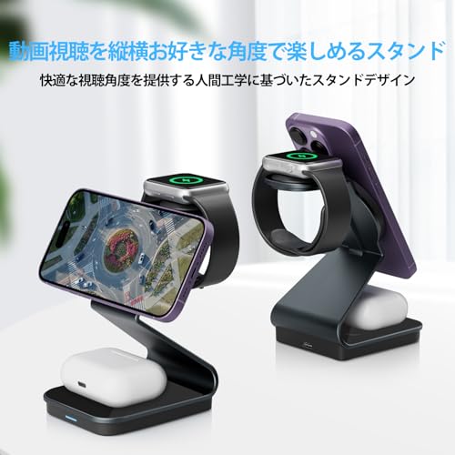3in1 ワイヤレス充電器 15W急速充電 マグセーフ 3台同時充電 放熱穴付 Type-Cケーブル付 取扱説明書付 Type-C給電 iPho