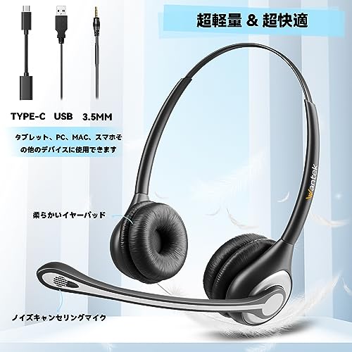 WantekヘッドセットUSB 3.5mm TypeC 両耳 ノイズキャンセリングマイク付きとオンライン制御有線PC用ヘッドホン Skype、W