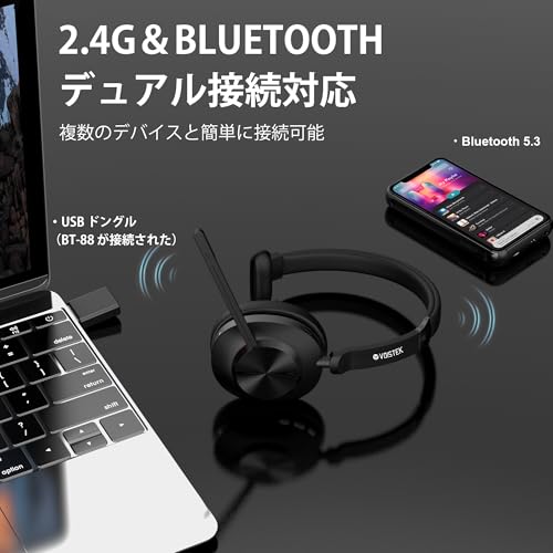 Bluetooth ヘッドセットUSBドングル付き-両耳/調整可能なサイズ/885BT 充電スタンドなし・Model:885BT 充電スタンドなし・【2.4G ドングル & Bluetooth デュアル接続方法】 Voistek ワイヤレスヘッドセットは最新 Bluetooth 5.3 技術搭載で、広い接続範囲と省電力性を実現。障害物少ない環境で最大 15m 安定接続し、遅延大幅低減。移動中も接続途切れなく、音楽・ゲーム・ワークに最適です。 同梱 USB ドングルで Bluetooth 未搭載 PC も簡単接続。PC 環境に関係なくワイヤレス快適性を損なわず利用可能。デュアル接続で多機器対応し、最適接続で高音質体験を提供します。・【よりクリアな通話 ENC ノイズキャンセリング技術】 voistek ワイヤレスヘッドセットは、最新 ENC ノイズキャンセリングマイク技術を採用し、周囲の雑音(車の音・人の喧騒など)を効果的に低減。オフィスや外での騒がしい環境でも、自動的に環境ノイズを除去しながら、話者の声を自然でクリアに伝達します。会議通話やリモートコミュニケーションで、不必
