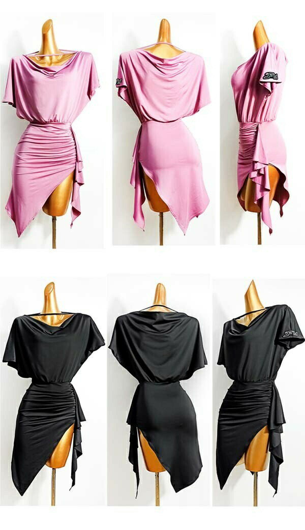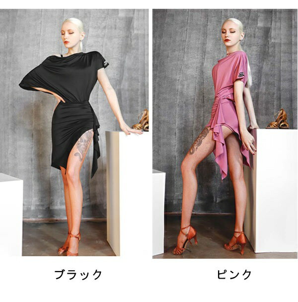 社交ダンス ドレス ダンスドレス ダンスウェア チャチャチャ ルンバ サンバ レッスン着 練習着 ワンピース 袖あり 半袖 ドルマン ポンチョスリーブ シャーリング 肩だし スリット イレギュラーヘム ピンク ブラック 無地 シンプル 衣装 ステージ セクシー S M L df097t2t2t2