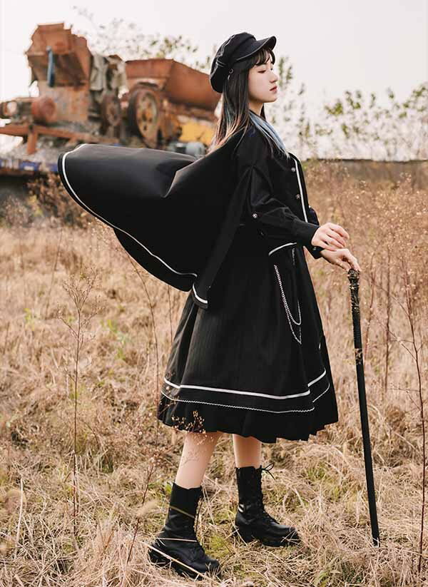 ロリータ ゴシック ゴスロリ ワンピース Aライン Lolita 長袖 黒 病みかわ 可愛い かっこいい ミモレ丈 マント追加可 レディース コスチューム 仮装 cos ハロウィン 学園祭 文化祭 dg309t2t2t2