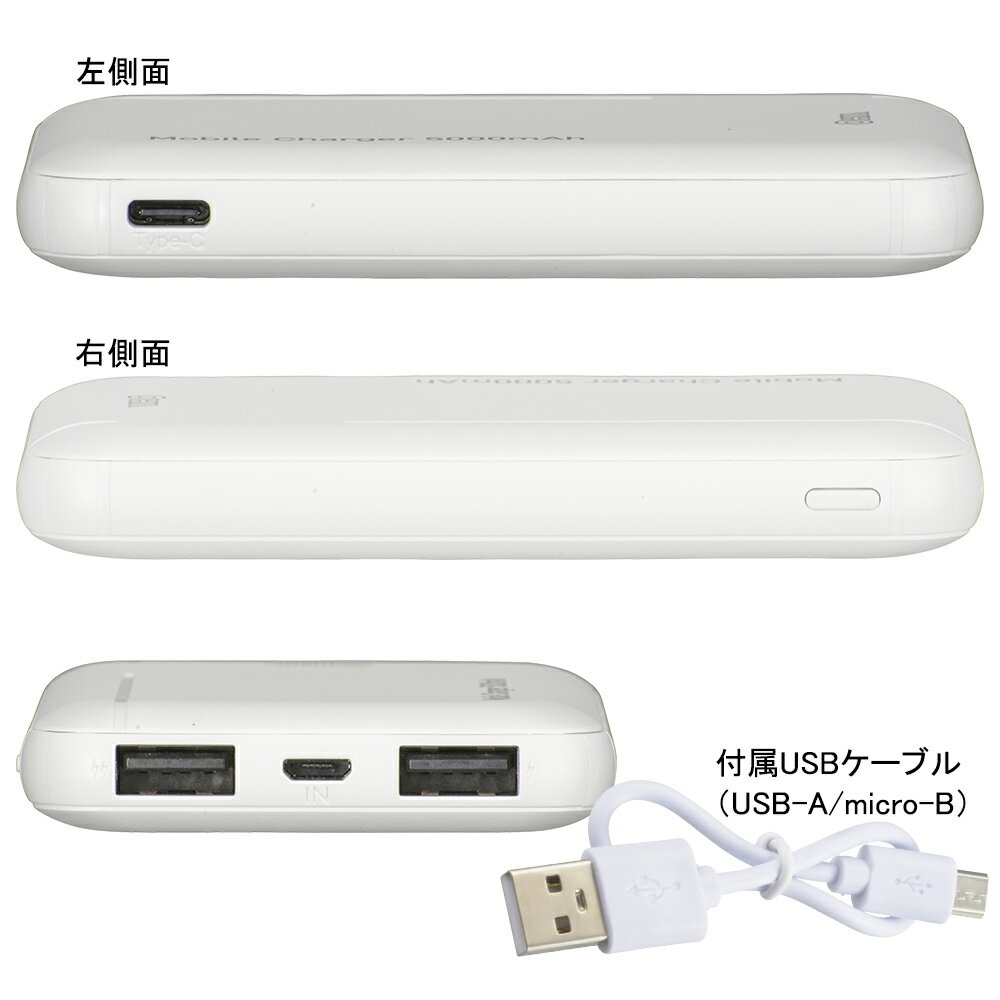 特長 ●合計最大出力2.4A、5000mAhタイプのモバイルチャージャー●出力USB Type-A 2ポート搭載、2台の機器を同時に充電できます●入力USB Type-C/micro-B 各1ポート搭載●スマートフォン、加熱式タバコの充電に●LEDで電池残量がすぐわかる●PSE適合品 商品仕様 ●充電式リチウムイオン電池:DC3.7V/5000mAh●定格入カ:DC5V/2.0A(Type-C/micro-B)●定格出力:DC5V/2.4A (Type-A×2ポート)※1●定格容量:DC5V/3200mAh●外形寸法:幅64×高さ100×奥行き14mm(突起部を除く)●本体質量:約107g●使用環境温度:温度5℃〜35℃、湿度10%〜85%(結露なきこと)●本体充電時間:約3時間(DC5V/2A以上使用時)●くり返し充電回数:約500回●付属品:充電用ケーブル(micro-B 約15cm)、保証書付取扱説明書●対応機種:iPhone/iPadシリーズ、Androidスマートフォン/タブレット、ゲーム機/デジカメ等USBで充電するタイプ※1 電流値は各出力が単独使用時の最大電流値で、同時使用する時には合計の電流値が2.4Aまでです。 【ご注意】 ※USB Type-Cポートで本体に充電する場合は、USB Type-Cケーブルが別途必要です。※パソコンのUSBポートから給電すると、パソコン側に悪影響を与える可能性がありますのでおやめください。