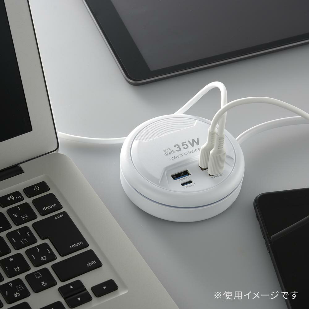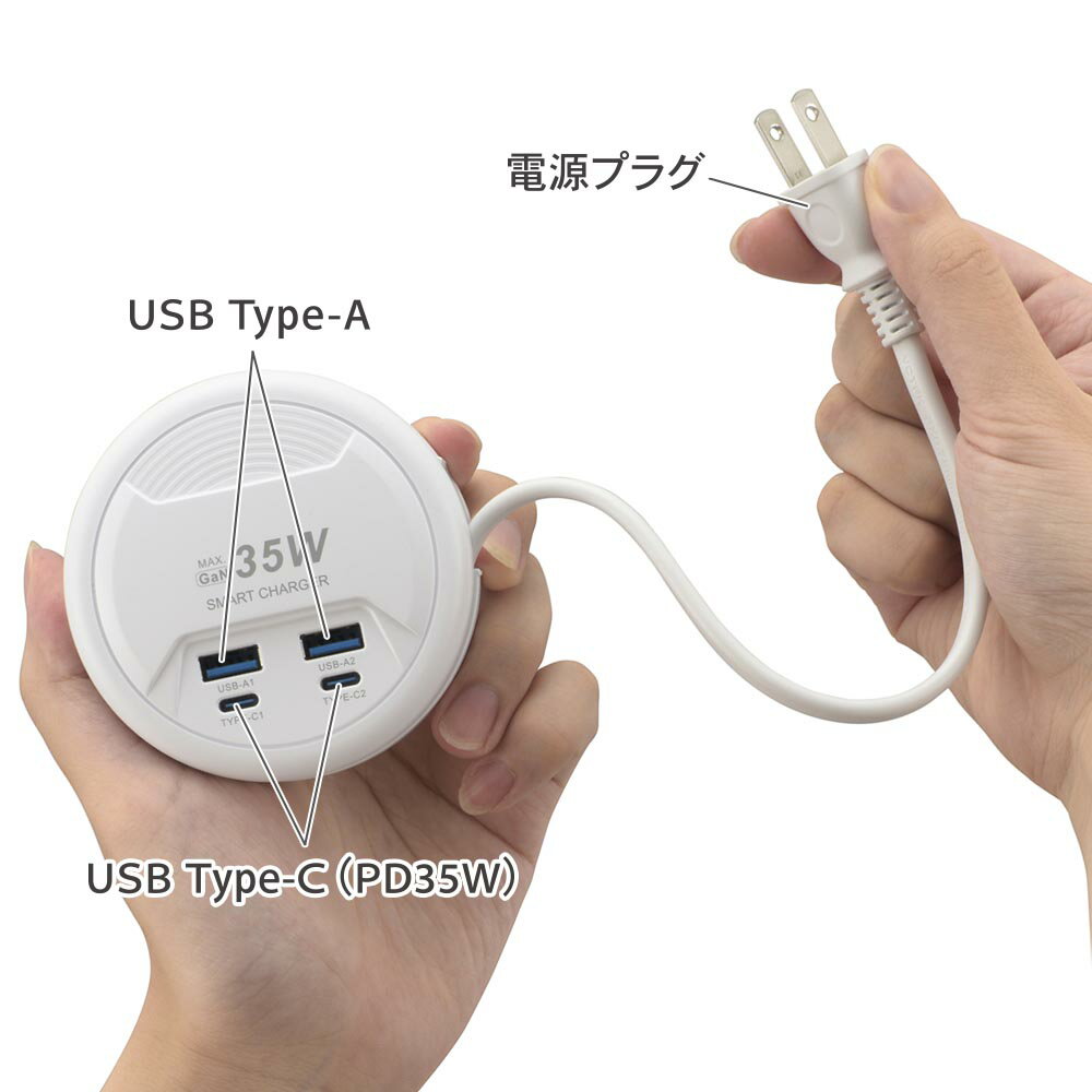 特長 ●合計最大出力 35W(USB Type-C 単独使用時)●くるっと収納●持ち運びに便利●超急速充電PD対応 ※Power Delivery急速充電には、Power Deliveryに対応した端末、各種ケーブルが必要です●Type-A×2、Type-C×2●耐圧や熱伝導、高速性に優れた特長を持つ次世代素材GaNを採用●接続機器を自動で判別して適切な電力で効率よく充電できます 商品仕様 ●定格入力:AC100-240V 0.8A 50/60Hz●定格出力:・Type-A+Type-C両方使用時…DC5V 合計3A・Type-A単独使用時…DC5V/3A、9V/2A、12V/1.5A・Type-C(PD35W)単独使用時…DC5V/3A9V/3A 12V/2.92 A15V/2.33A 20V/1.75A・PPS規格対応…DC4.5-11V/3A●出力端子:USB Type-A×2 Type-C×2●コード長:約45cm●外形寸法:(約)直径87×高さ29mm(コード長除く)●質量:136g 【ご注意】 ※通信機能付きのUSBケーブルではご使用いただけない場合があります。※USBケーブルは付属しておりません。お使いの機器に対応したUSBケーブルを別途ご用意ください。(機器に付属する純正品のご使用を推奨いたします。)※機器によっては本機での充電中に音楽再生などの機能が使用できない場合があります。メーカー取寄品