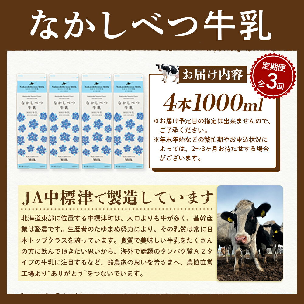 【ふるさと納税】【定期便:全3回】なかしべつ牛乳1L×4本 牛乳 ミルク 乳製品 乳飲料 健康 朝食 高栄養 国産 お取り寄せ 定期便 3ヶ月 ふるさと納税 北海道 中標津町 中標津【14058】