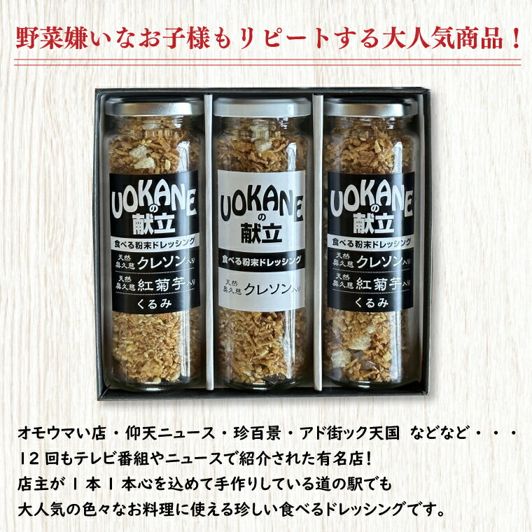 人気テレビ!! 【オモウマい店・仰天ニュース・珍百景・アド街ック天国】などなど・・・ 12回もテレビ番組やニュースで紹介された有名店! 店主が1本1本心を込めて手作りしている 道の駅でも大人気の色々なお料理に使える珍しい食べるドレッシングです。 <野菜嫌いなお子様もリピートする大人気商品です> 天然クレソン・天然紅菊芋など史上最強のスーパーフードを使った・・身体にご褒美!食べる粉末ドレッシングです。 ==食べ方いろいろ== 生野菜サラダや、温野菜、和えもの、野菜の炒め物(キャベツや、きのこソテーがおすすめ)、バターライスや、チャーハン、パスタにも! バーベキュー、キャンプなどのアウトドアにも!アイデア次第でいつものお料理が格段に美味しくなります!! 是非この機会に ふるさと納税で お召し上がり下さい。 名 称 UOKANEの献立 食べる粉末ドレッシング2種類(3本セット) 内容 粉末ドレッシング白ラベル(クレソン) 50g×1 粉末ドレッシング黒ラベル(クレソン、紅菊芋、クルミ) 50g×2 白ラベル1本 黒ラベル2本 計3本 化粧箱入り 賞味期限 製造より90日 保存方法 常温 アレルギー 乳、小麦、牛肉、くるみ、大豆、ごま 発送時期 ご入金確認後、30日程度で順次発送致します。 提供元 UOKANE ・ふるさと納税よくある質問はこちら ・寄付申込みのキャンセル、返礼品の変更・返品はできません。あらかじめご了承ください。UOKANEの献立 食べる粉末ドレッシング2種類(3本セット)【調味料 食べ比べ クレソン スーパーフード サラダ 炒め物 チャーハン パスタ 健康 贈答 プレゼント】 入金確認後、注文内容確認画面の【注文者情報】に記載の住所に20日以内に発送いたします。 ワンストップ特例申請書は入金確認後20日以内に、お礼の特産品とは別に住民票住所へお送り致します。