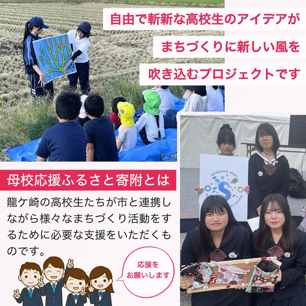 お礼品の詳細 この母校応援ふるさと寄附は、茨城県立竜ヶ崎第二高等学校と龍ケ崎市が連携して行う様々なまちづくり事業に皆さまからのを寄附を活用させていただきます。 【ふるさと納税での母校応援とは?】 高校生たちの自由な発想で考え自らが活動することで、自分たちが通学するまちへの参加機会を増やし、郷土愛を育むともに卒業後もまちに関わりたいと思う参画意欲の醸成を図ることを目的としています。 地域学習の授業の一環で、高校生がチャレンジする場づくりや龍ケ崎市民との交流の場をつくる活動の財源をふるさと納税とすることで、今まで以上の充実した内容に発展させることが可能となります。 そのほか、自分たちの活動を応援してくれる大人(寄附したくれた人)に対して、感謝の気持ちを持つことによって、自身が受けた感謝を卒業後に母校の生徒に返すことができるグッドサイクルを生み出していきたいと考えております。 【卒業生でないと寄附できないの?】 卒業生の皆さまや頑張る高校生の活動を応援したい思う方でしたら誰でも寄附が可能です。 ぜひ、皆さまからのご支援をお待ちしております。 【この寄附の使い道はどうなるの?】 茨城県立竜ヶ崎第二高等学校が龍ケ崎市と連携して行うまちづくり事業への「思いやり型返礼品 (協賛型) 」になります。 当該ページでの寄附については、連携事業で行われる活動にのみ使用されます。 【これまでの取組のご紹介】 ・龍ケ崎市での街歩きイベントにおいて高校生がお客様をアテンド ・全国コロッケフェスティバルにおいて竜二高オリジナルコロッケの開発・販売 ・市内の農家と連携し、田植えイベントへのボランティア参加 ・龍ケ崎市SDGsフェアにおいて缶バッジのデザインを作成 商品名 <思いやり型返礼品> 母校応援 ふるさと納税 茨城県立竜ヶ崎第二高等学校 お礼品の内容について 【返礼品なし】 母校応援ふるさと納税(竜ヶ崎第二高等学校) 製造地 茨城県龍ケ崎市 注意事項/その他 ※このご寄附についてはお礼品の配送はございません。ご了承ください。 ※「寄附金の使い道を選択」において、どの使い道を選択いただいても「母校応援ふるさと寄附(竜ヶ崎第二高等学校)」への支援とさせていただきます。 ※予算を超えるご寄附が集まる等、やむをえない理由により上記使い道に活用できない場合は、本市の教育・子育てに関する取組に充当させていただく場合がございますので、ご了承ください。 事業者情報 龍ケ崎市役所 申込条件 何度も申し込み可 寄付回数の制限は設けておりません。 寄付をいただく度にお届けいたします。 申込期日 通年 発送期日 返礼品はございません。 配送 なし 配送不可地域 なし 関連キーワード 思いやり型 返礼品 教育支援 母校支援 母校 応援 支援 竜ヶ崎二高 茨城県 龍ケ崎市 寄付金の用途について 【ふるさと納税】寄付金は、下記の事業を推進する資金として活用してまいります。 1 未来を担う子どもたちのための事業 2 まちの魅力を高めるための事業 3 健康で安心して暮らすための事業 4 自然と文化を受け継ぐための事業 5 その他市長が必要と認めるもの 6 「スポーツクライミングのまち」を推進する事業 ふるさと納税の注意事項 ・ふるさと納税に関するよくあるご質問はこちらです。 ・寄付申込みのキャンセル、返礼品の変更・返品はできません。 ・寄付者の都合で返礼品が届けられなかった場合、返礼品等の再送はいたしません。 ・天候・交通等により発送にお時間をいただく場合がございます。 ・画像はイメージです。寄付金の用途について 「ふるさと納税」寄付金は、下記の事業を推進する資金として活用してまいります。 1 未来を担う子どもたちのための事業 2 まちの魅力を高めるための事業 3 健康で安心して暮らすための事業 4 自然と文化を受け継ぐための事業 5 その他市長が必要と認めるもの 6 「スポーツクライミングのまち」を推進する事業 ふるさと納税の注意事項 ・ふるさと納税に関するよくあるご質問はこちらです。 ・寄付申込みのキャンセル、返礼品の変更・返品はできません。 ・寄付者の都合で返礼品が届けられなかった場合、返礼品等の再送はいたしません。 ・天候・交通等により発送にお時間をいただく場合がございます。 ・画像はイメージです。