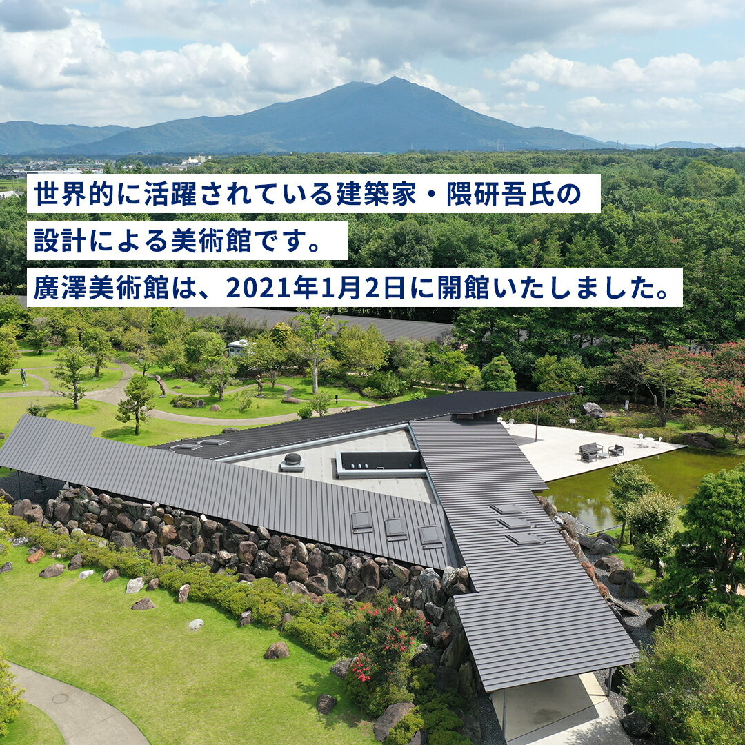建築、庭園、そしてアート。唯一無二の美術館体験を。 世界的に活躍されている建築家・隈研吾氏の設計による美術館です。 隈研吾氏は、新国立競技場他、国内外の数々のプロジェクトに携わられてきております。廣澤美術館は、2021年1月2日に無事、開館いたしました。 建物を囲む3つの庭は、「浄(きよら)の庭」、「炎(ほむら)の庭」、「寂(しじま)の庭」と名付けられ、全体で「つくは野の庭」と総称します。 「つくは」は、筑波の古くからの呼び名です。 命名者は、万葉集研究の第一人者であり、元号「令和」の考案者とされる中西進氏です。 作庭家の斉藤忠一氏による日本庭園、ランドスケープアーキテクトの宮城俊作氏による二つの庭は、隈研吾氏設計の建物とともに、廣澤美術館の大きな見どころです。 【事業者紹介】 筑波山の麓に100万平方メートルのテーマパーク 「自然・健康・文化」をテーマとした一つの郷(まち)それが「ザ・ヒロサワ・シティ」です。 筑波山を望める自然豊かな場所で、訪れた人々がふれあい・楽しみ・心豊かに過ごせる場所を提供しています。 「自然系」 貸農園、クラインガルテン、広沢農園、バーベキュー場、ドッグラン 「健康スポーツ系」 下館ゴルフ倶楽部、下館パークゴルフ場、下館オフロードコース、マウンテンバイク オフロードコース 「文化系」 廣澤美術館、国立科博廣澤航空博物館、レールパーク、消防自動車博物館 商品詳細 名称 廣澤美術館 観覧券(大人1枚) 内容量 廣澤美術館観覧券(大人1枚) 申込期日 通年 配送 寄附入金確認後1~2週間で発送 常温配送 事業者 株式会社広沢製作所 地場産品類型:7 類型該当理由:市内で実施される体験型返礼品であるため。 ふるさと納税よくある質問はこちら 寄附申込みのキャンセル、返礼品の変更・返品はできません。あらかじめご了承ください。 ※下記の「商品仕様」は、AIによって判断されたデータのため、上記の商品情報にてご確認ください。廣澤美術館 観覧券(大人1枚) 受領証明書及びワンストップ特例申請書のお届けについて ■寄附受領証明書■ ご入金確認後、2週間程度で注文内容確認画面の【注文者情報】に記載の住所に、郵便でお送りいたします。 ■ワンストップ特例申請書■ 12月20日までの寄附申込でワンストップ特例制度を希望される方には,筑西市より『ワンストップ特例申請書』を郵送いたします。 なお,12月21日以降に,ワンストップ特例制度を希望されます方は,大変恐れ入りますが寄附者ご自身で様式をダウンロードいただくとともに,必要事項を記入のうえご寄附いただきました翌年の1月10日(必着)までに筑西市宛て郵送くださるようお願いいたします。 詳細につきましては『筑西市HP「ふるさと納税ワンストップ特例制度」について』をご覧ください
