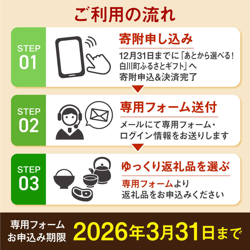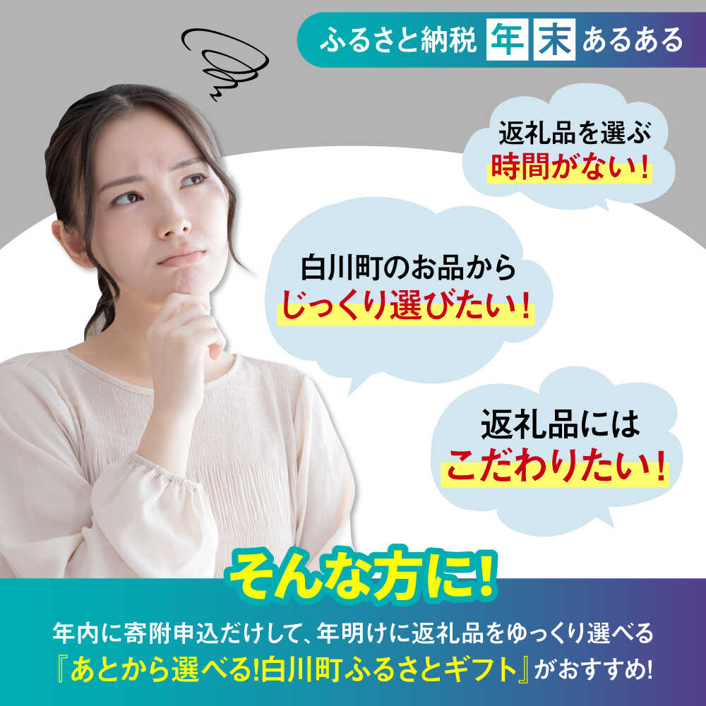 今年中に寄附申込をしたいけど、返礼品を選ぶ時間がない! そんな方のために、年内に寄附申込だけして、年明けに返礼品をゆっくりえらべる 「あとから選べる!白川町ふるさとギフト」をご用意いたしました! 魅力的なお品物の中から、ぜひゆっくりお選びください♪ たとえば、人気のアイテムは ・飛騨牛、豚肉、鶏ちゃん、ハンバーグ、ハム ・白川茶、五平餅、朴葉寿司 ・栗菓子、大福、焼き菓子 ・クラフトビール、サウナ、宿泊、体験 などがございます。 ■ご利用の流れ 1.2025年12月31日までに「あとから選べる!白川町ふるさとギフト」へ寄附申込&決済完了 2.メールにて専用フォームログイン情報をお送りします 3.ポータルサイトのページを参考に、ゆっくり返礼品を選ぶ 4.専用フォームより返礼品をお申込みください ※返礼品お申込み期限:2026年3月31日まで ■必ずご確認ください ・専用フォーム申込期限は【2026年3月31日まで】です。必ず期間内に返礼品をお申込み完了ください。 ・白川町で掲載中の返礼品の中からお選びいただけます。ポータルサイトの返礼品情報を参照しながら、専用フォームへご入力ください。 ・あとからギフト一口のお申込みにつき、専用フォームは1回限りご回答いただけます。複数回に分けてお申込みいただくことはできかねますので、予めご了承ください。 ・お選びいただいた返礼品の組み合わせにより寄附金額に余りが発生した場合は「白川町ふるさと応援寄附金」として納めさせていただきます。 ・在庫数に限りがある返礼品もございますので、お申込みのタイミングによっては、ご希望の返礼品をお選びいただけない場合がございます。 あとから選べる 白川町ふるさとギフト 9万円分 寄付 あとから寄附 あとからギフト あとからセレクト あとからチョイス あとから選べる 岐阜県 駆け込み寄附 後から選べる 後から選べるギフト 後からセレクト 先に寄付 9万円 90000円今年中に寄附申込をしたいけど、返礼品を選ぶ時間がない! そんな方のために、年内に寄附申込だけして、年明けに返礼品をゆっくりえらべる 「あとから選べる!白川町ふるさとギフト」をご用意いたしました! 魅力的なお品物の中から、ぜひゆっくりお選びください♪ たとえば、人気のアイテムは ・飛騨牛、豚肉、鶏ちゃん、ハンバーグ、ハム ・白川茶、五平餅、朴葉寿司 ・栗菓子、大福、焼き菓子 ・クラフトビール、サウナ、宿泊、体験 などがございます。 ■ご利用の流れ 1.2025年12月31日までに「あとから選べる!白川町ふるさとギフト」へ寄附申込&決済完了 2.メールにて専用フォームログイン情報をお送りします 3.ポータルサイトのページを参考に、ゆっくり返礼品を選ぶ 4.専用フォームより返礼品をお申込みください ※返礼品お申込み期限:2026年3月31日まで ■必ずご確認ください ・専用フォーム申込期限は【2026年3月31日まで】です。必ず期間内に返礼品をお申込み完了ください。 ・白川町で掲載中の返礼品の中からお選びいただけます。ポータルサイトの返礼品情報を参照しながら、専用フォームへご入力ください。 ・あとからギフト一口のお申込みにつき、専用フォームは1回限りご回答いただけます。複数回に分けてお申込みいただくことはできかねますので、予めご了承ください。 ・お選びいただいた返礼品の組み合わせにより寄附金額に余りが発生した場合は「白川町ふるさと応援寄附金」として納めさせていただきます。 ・在庫数に限りがある返礼品もございますので、お申込みのタイミングによっては、ご希望の返礼品をお選びいただけない場合がございます。 商品説明 名称【あとから選べる】白川町ふるさとギフト 9万円分 寄付 あとからギフト 後から選べる 後からセレクト 先に寄付 岐阜県 飛騨牛 豚肉 鶏肉 お茶 ゴルフ 9万円 90000円 内容量あとから選べる 白川町ふるさとギフト 9万円分 配送方法常温 配送期日入金確認後2週間以内にメールにて専用フォームログイン情報をお送りします。 返礼品の発送は、各返礼品ページの納期をご参考ください。 提供事業者あとから選べるギフト 寄付 あとから寄附 あとからギフト あとからセレクト あとからチョイス あとから選べる 岐阜県 駆け込み寄附 後から選べる 後から選べるギフト 後からセレクト 先に寄付 9万円 90000円