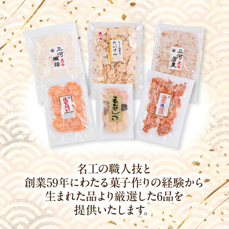 特産品説明 名称 【ふるさと納税】赤えび生姿焼き、生せんべいなどのセット 内容量 赤えびの生姿焼き1袋(44g) 生せんべい1袋(68g) 三河織姫1袋(79g) 三河彦星1袋(79g) たいせんべい1袋(133g) えびせんアラカルト1袋(18g) 原材料 【赤えびの生姿焼き】海老、馬鈴薯澱粉、塩/調味料(アミノ酸等) 【生せんべい】海老、澱粉、塩、砂糖/調味料(アミノ酸等)、着色料(ベニコウジ色素) 【三河織姫】澱粉、海老、砂糖、塩、植物油/調味料(アミノ酸等)、着色料(ベニコウジ色素、カロチノイド) 【三河彦星】澱粉、いか、塩、植物油/調味料(アミノ酸等)、甘味料(ステビア) 【たいせんべい】澱粉、海老、塩、砂糖、海苔、醤油(大豆、小麦)、水飴/調味料(アミノ酸等)、甘味料(ステビア)、着色料(ベニコウジ色素) 【えびせんアラカルト】澱粉、海老、いか、いわし、ごま、砂糖、塩、海苔、梅肉、抹茶、植物油、醤油(小麦、大豆)、水飴、酵母エキス、みりん、澱粉分解物/調味料(アミノ酸等)、甘味料(ステビア、甘草)、着色料(ベニコウジ色素)、香料、香辛料抽出物 アレルギー 小麦・えび・いか・大豆・ごま 本品製造工場では、えびを含む製品を製造しています。 賞味期限 赤えび生姿焼き:出荷日+冷蔵で6日 生せんべい:常温で2か月 えびせんアラカルト:常温で4か月 三河織姫、三河彦星、たいせんべい:常温で5か月 配送温度帯 冷蔵 説明 弊社の名工の職人技と創業59年にわたる菓子作りの経験から生まれた、数ある商品の中から選りすぐった6品を提供いたします。 特に弊社オリジナルである「赤えびの生姿焼き」は素材の味を生かす為、あえて生しく焼き上げた逸品です。 焼きたての商品をお送りいたしますので、お早めにご賞味ください。 「生せんべい」も、生海老の味を生かす為、丸剥きのエビだけを使用し、あえて生しく焼き上げた商品です。 「三河織姫」は、丸剥きにした生海老をふんだんに使い、手焼きの製法で焼き上げた素焼きせんべいの代表的商品です。 「三河彦星」は、真イカに北海道産の馬鈴薯澱粉をまぶし、手焼きで素焼きにした逸品です。 「たいせんべい」は、軽い食感と甘辛醤油が美味しさを引き立たせてくれます。 「えびせんアラカルト」は、様々な味をお楽しみいただけるよう、ミックスしてあります。 生産者の声 西尾市一色町は、古くからえびせんべいの産地として知られています。 創業以来半世紀を越えるえびせんべいづくりの歴史を持つ弊社の職人技と経験から生まれた数ある商品の中から、選りすぐりの品を詰め合わせてご提供いたします。 注意事項/その他 赤えびの生姿焼きは賞味期限が短い商品ですので、到着後、冷蔵保存をして早めにお召し上がりください。 せんべいは直射日光・高温多湿を避けて保存してください。 提供事業者 株式会社ヤマ伍三矢商店 地場産品基準 第3号:西尾市内で仕入れから加工、梱包までの全工程を行っているため。 西尾市について 西尾市は、愛知県の中央を北から南へ流れる矢作川流域の南端に位置し、東は三ヶ根山などの山々が連なり、西は矢作川が流れ、南は三河湾を望みます。 鎌倉時代に足利義氏によって築かれたと伝えられる「西条城」は、この地域の拠点として発展を続け、「西尾城」と改称された江戸時代に城下町が形成されました。明和元年(1764年)、大給松平家の居城となると、六万石城下町として商業がさらに賑わいを見せるようになり、その栄華は祇園祭として有形無形で今も大切に残されています。 そのような歴史を有する西尾市は、市制を施行した昭和28年12月15日以降、西三河南部の中核的な都市として、自動車関連産業の発展とともに成長し続けてきました。平成23年4月1日には一色町、吉良町、幡豆町と合併し、令和2年で10年目を迎えています。 合併により、抹茶(てん茶)やカーネーション、養殖うなぎなどの全国有数の地域資源を数多く有することとなった西尾市は、農水産物の生産も盛んで、農業、工業、商業のバランスの取れた産業を展開しています。 特に「一色産うなぎ」、「西尾の抹茶」、「三河一色えびせんべい」は特許庁の地域団体商標(地域ブランド)にも認定されている全国に誇る三大ブランドです。 また、市内には歴史的な史跡や名所が点在し、伝統的な祭りや民俗芸能も多く伝えられているほか、海・山・川など自然環境も豊かな「自然と文化と人々がとけあい、心豊かに暮らせるまち」それが六万石城下町・西尾です。 ・ふるさと納税よくある質問はこちら ・寄付申込みのキャンセル、返礼品の変更・返品はできません。あらかじめご了承ください。【ふるさと納税】赤えび生姿焼き、生せんべいなどのセット