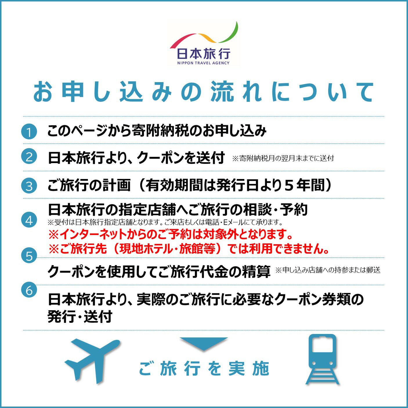 名称 【ふるさと納税】日本旅行 地域限定旅行クーポン 90,000円分【T003400】有効期限5年間 発送時期 ご入金確認後、翌月末までに送付 ※送付日の希望はお受けできません 提供元 株式会社 日本旅行 配達外のエリア なし 関連ワード 今治 いまばり 愛媛県 えひめ 休日 休暇 旅 旅行 仕事 リゾート ホテル 宿 旅館 宿泊 券 チケット お礼品の特徴 今治市内に1泊以上の宿泊を伴うご旅行であれば、宿泊費だけでなく、現地までの交通費や現地での観光・体験等の精算にまで幅広く利用できる地域限定旅行クーポンです。 有効期間は発行日より5年間OK! ご旅行の相談・予約は、日本旅行予約担当店舗で受け付けております。 ご来店もしくは電話・Eメールにて承ります。 ※日本旅行ホームページなど、インターネットからのご予約は対象外となりますのでご注意ください。 ※当クーポンはご旅行先(現地ホテル等)で直接ご利用いただくことはできません。 ※キャンセル規定:クーポン自体のキャンセル及び返品は不可。ご旅行についてはご契約の旅行条件書に準じます。 ■内容量 今治市内に1泊以上を条件とする、旅行代金の精算に利用できるクーポン。 30,000円分×3枚=90,000円分 【お申込み・ご使用にあたっての注意事項】 ■寄附のご入金確認後、利用に関する案内書面とともに「旅行クーポン」を郵送(簡易書留)にてお送りします。 ■申込状況によってクーポンの発送までに1ケ月程度かかる場合があります。予めご了承の上、お申込みください。 ■クーポンお届け時にご不在の場合、郵便局での保管期間は7日間となります。ご注意ください。 ■当クーポンには、寄附自治体名、お申込みいただいた方もしくは送付先の方のお名前、発行日および有効期限が印字されています。届きましたらお申込み枚数と合わせてご確認ください。 ■当クーポンを使用できるのはご本人様に限ります(第三者への譲渡は不可)。ご旅行参加者はご本人以外の方も有効です。 ■当クーポンは寄付自治体内の宿泊施設に宿泊する旅行をお申し込みの場合に限り、ご旅行の精算にご利用いただけます。 なお、合わせて寄付自治体外の宿泊施設の予約を承ることも可能ですが、寄付自治体外の宿泊代金の精算に当クーポンをご利用いただくことはできません。 ■利用できるのは株式会社日本旅行の契約施設に限ります。 ■当クーポンは、1枚30,000円分です。お釣りは出ません。 ■ご旅行代金精算に際して、当クーポンを受付店舗までご持参又はご送付いただくことが必要です。 ご送付の場合、封筒のご準備及び送料等は、お客様のご負担となりますのであらかじめご了承ください。 ■旅行お申し込み後、お客様都合で旅行を取消され取消料が発生する場合は、現金又はクレジットカードで取消料の精算をしていただきます。 クーポンは、ご返却しますので次のご旅行にご利用ください。 ■その他詳しいご利用条件は、クーポンと合わせて送付させていただくご案内書面をご参照ください。 ■寄附お申し込み後、クーポン自体のキャンセル及び返品はお受けいたしかねますので、予めご了承ください。 ■総務省告示第二百三号を受け、2024年10月1日以降の発行分より、当該宿泊施設の運営会社が該当自治体の属する都道府県外にも施設展開している場合、1人1泊5万円を超えるものはクーポン精算の対象外となります。 ■注意事項/その他 ・画像はイメージです。 ・ふるさと納税よくある質問はこちら ・寄附申込みのキャンセル、返礼品の変更・返品はできません。あらかじめご了承ください。