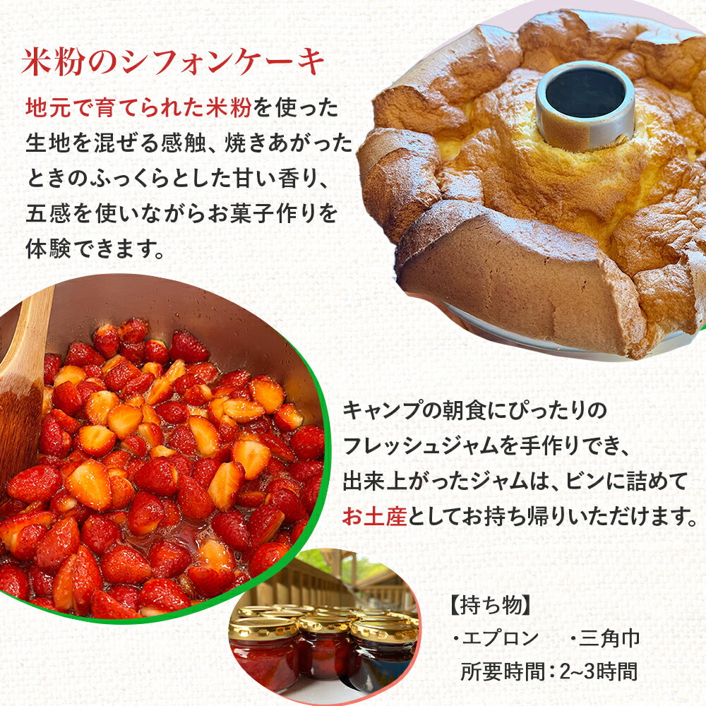 四万十川の大自然で育った『季節の果物ジャムとオリジナルシフォンケーキづくり体験』 商品説明名称四万十川の大自然で育った『季節の果物ジャムとオリジナルシフォンケーキづくり体験』 内容季節の果物ジャムとオリジナルシフォンケーキづくり体験チケット(2名利用券) ご予約の流れ ・寄付完了後、体験チケットの送付 ・体験希望日を三島キャンプ場に電話予約 ・体験当日にチケットを持参商品説明四万十川の大自然の中で育った旬のフルーツと米粉を使って、ジャム作りとヘルシーなシフォンケーキ作りに挑戦してみませんか? まさに、地産地消そのものと言えるこちらの体験は、ほとんどの材料が四万十川に囲まれた三島キャンプ場周辺で育った食材を使用しています。 キャンプの朝食にぴったりのフレッシュジャムを手作りでき、さらに、地元で育てられた米粉を使ったふわふわシフォンケーキ作りの後は、四万十川の景色を眺めながら、ほっと一息ティータイム。 地元の方とおしゃべりしながら、楽しく美味しいひとときを過ごしましょう。 出来上がったジャムは、ビンに詰めてお土産としてお持ち帰りいただけます。 【三島キャンプ場でしか味わえないジャムづくり&シフォンケーキ体験】 ・地元の元気ばあちゃんから地元食材の活用と四万十の自然と共に生きる暮らしなど、おしゃべりを楽しみながら雨の日でも室内で体験していただけます。 ・四万十川の自然の恵みを味わう: 四万十川に囲まれた三島キャンプ場周辺で丹精込めて育てられた旬のフルーツとお米を米粉にして、四万十オリジナルの味をお楽しみください。 四万十の自然の中で五感を研ぎ澄ます:旬のフルーツの香り、生地を混ぜる感触、焼きあがったときのふっくらとした甘い香り、五感を使いながらお菓子作りを体験できます。 ・手作りならではの味わい: 市販のものとは違う、三島キャンプ場でしか味わえない旬のフルーツジャムとシフォンケーキを作ることができます。 【体験で得られるもの】 ・お菓子作りの基礎知識: 材料の分量、調理時間、火加減など、お菓子作りの基本を学ぶことができます。 ・創造性: レシピをアレンジしたり、オリジナルの代替えレシピを考えたりすることで、創造性を養うことができます。 ・達成感: 自分で作ったお菓子を味わうことで、大きな達成感を得られます。 【こんな方におすすめ】 ・お菓子作りが好きな方 ・手作りにこだわりたい方 ・家族や友人、お孫さんと楽しい時間を過ごしたい方 【持ち物】 ・エプロン ・三角巾 実施期間:通年(ご希望の日にちをお伺いし担当者と日程調整をいたします) 所要時間:2~3時間 詳細:キャンプ場受付にお越しください。 旬のフルーツを使ったジャム作りと、ヘルシーな米粉シフォンケーキ作りを同時に楽しめる、貴重な体験です。ぜひご参加ください。 申込期日通年 発送期日決済から2週間以内に体験チケット発送 提供元三島観光組合しまんと三島キャンプ場 ・ふるさと納税よくある質問はこちら ・寄附申込みのキャンセル、返礼品の変更・返品はできません。あらかじめご了承ください。