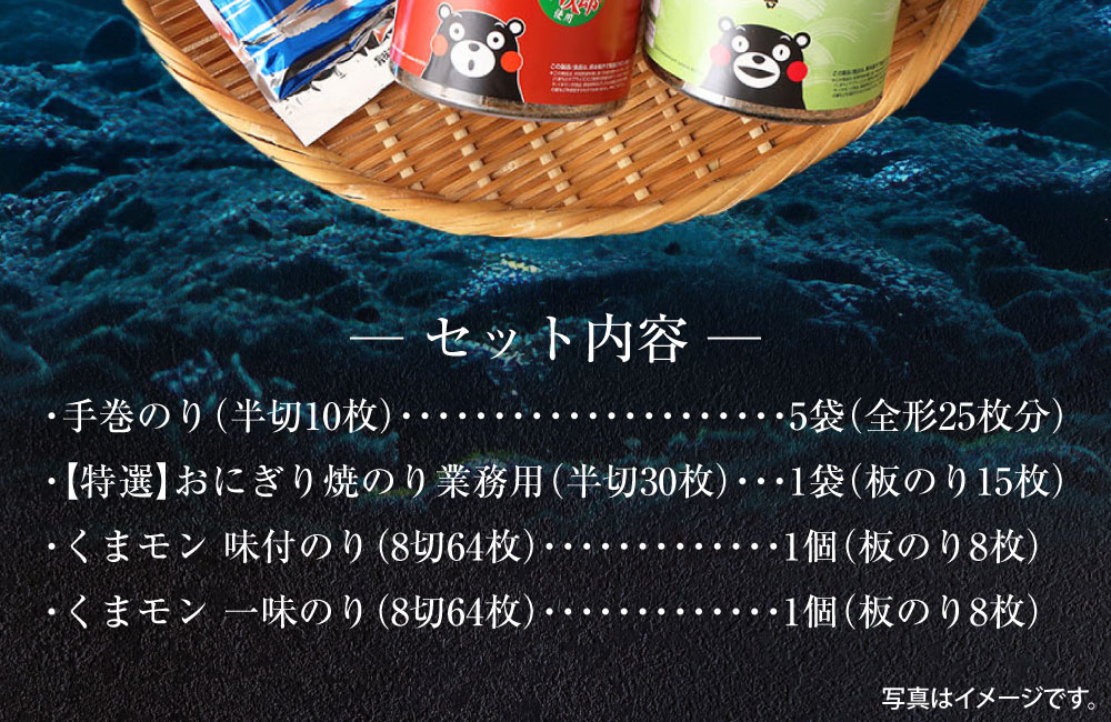 【ふるさと納税】海苔 詰合せ1 手巻のり 特選おにぎり焼きのり くまモン 味付のり 一味のり 4種 ノリ 焼のり 焼海苔 有明海苔 味海苔 味付海苔 おにぎり 手巻き 寿司 ごはん おつまみ チャック付 乾物 セット 詰め合わせ 食べ比べ 九州