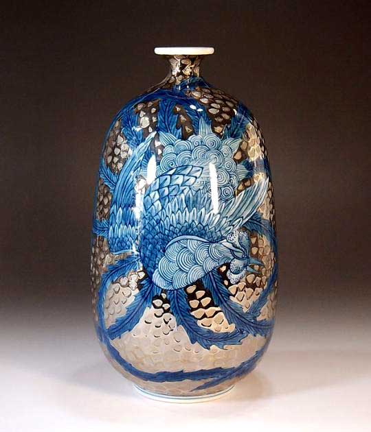 有田焼・伝統工芸・総手描き染錦プラチナ彩鳳凰絵飾り花瓶陶芸作家 藤井錦彩 作