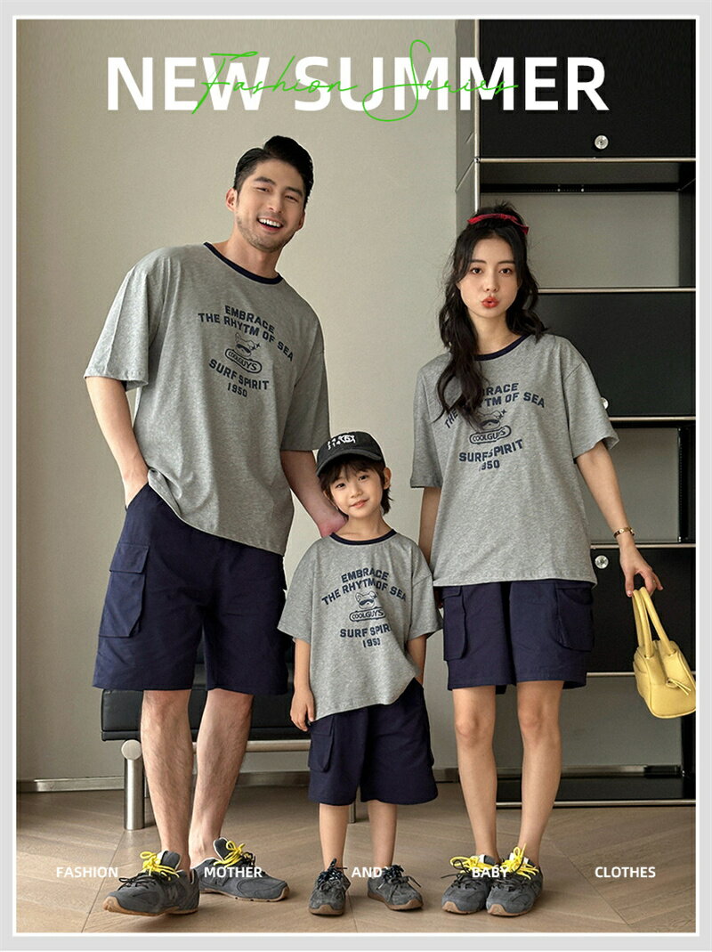 親子 リンクコーデ tシャツ グレー 半袖 トップス 家族お揃い セットアップ ネイビー ハーフパンツ 親子ペア 親子ペアルック カップル 男の子 女の子 ママと娘 お揃い 旅行 子供服 夏 記念日 家族写真 ギフト